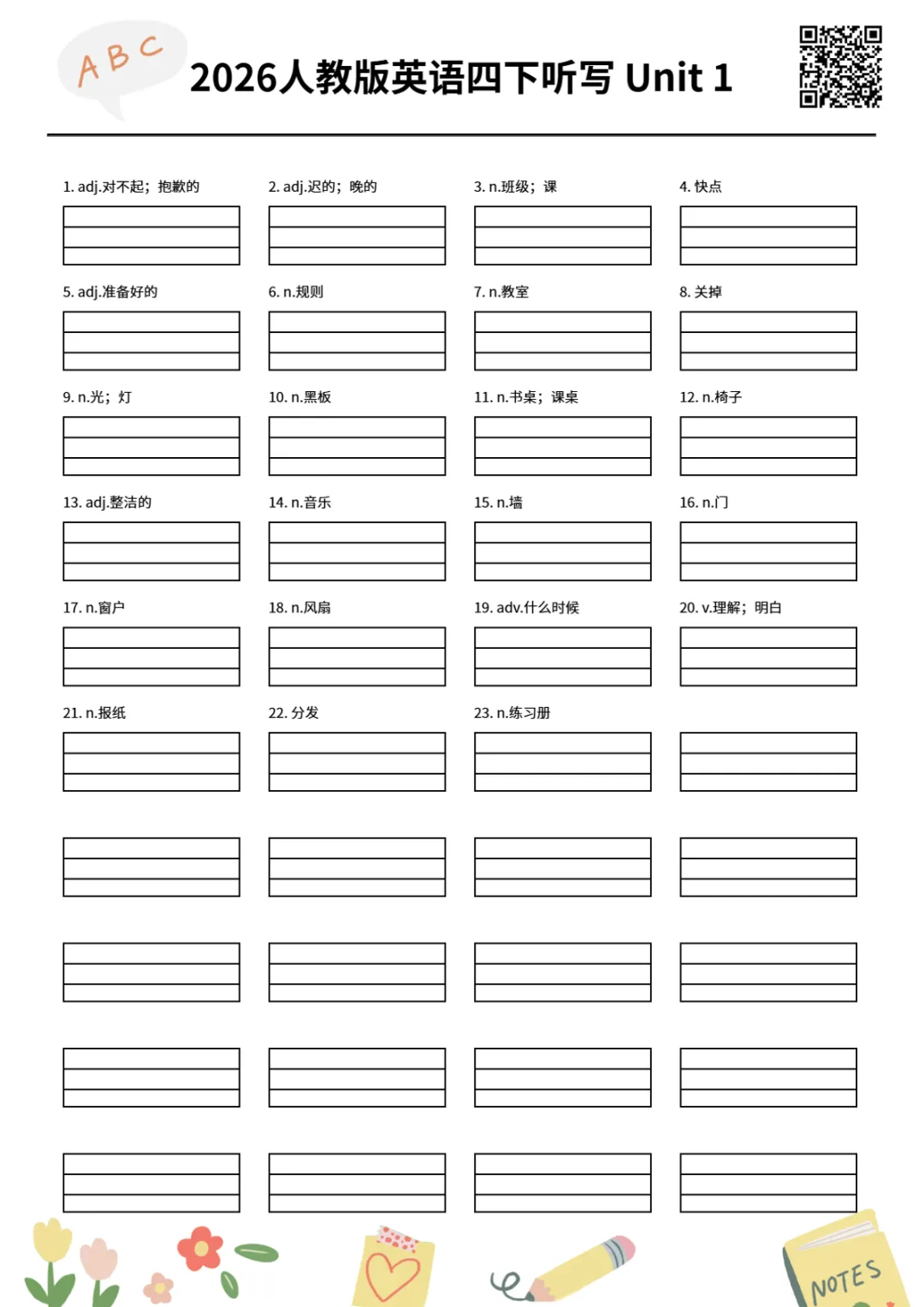 【免费下载】四年级(下)英语 Unit1-6 默写纸《人教版PEP》,PDF电子版,共7页,可打印