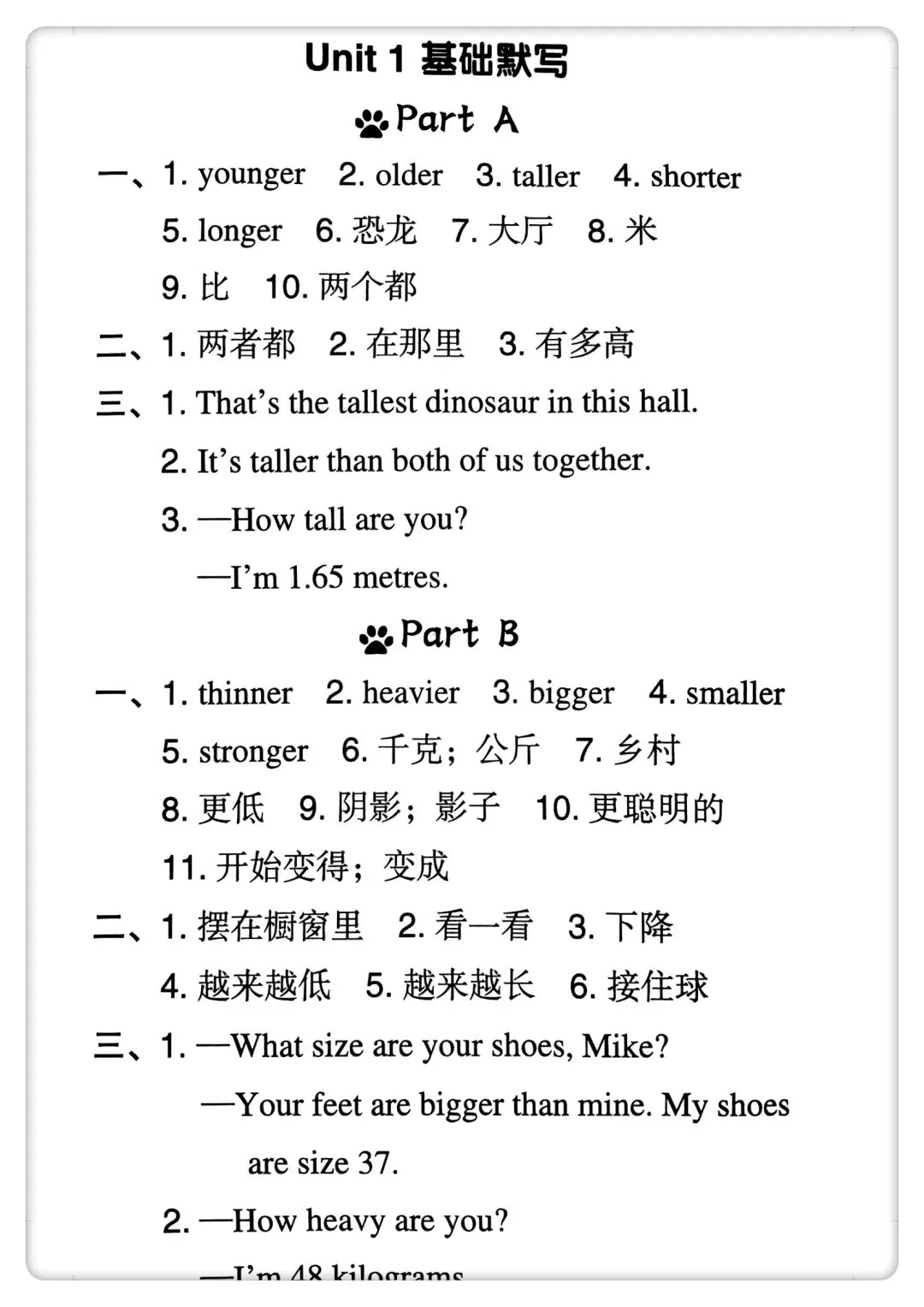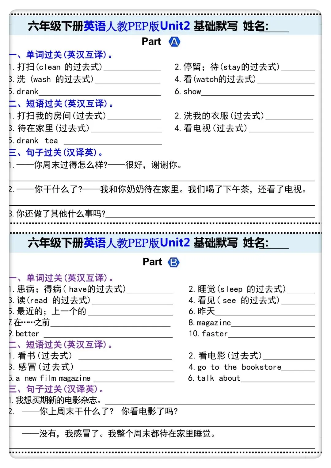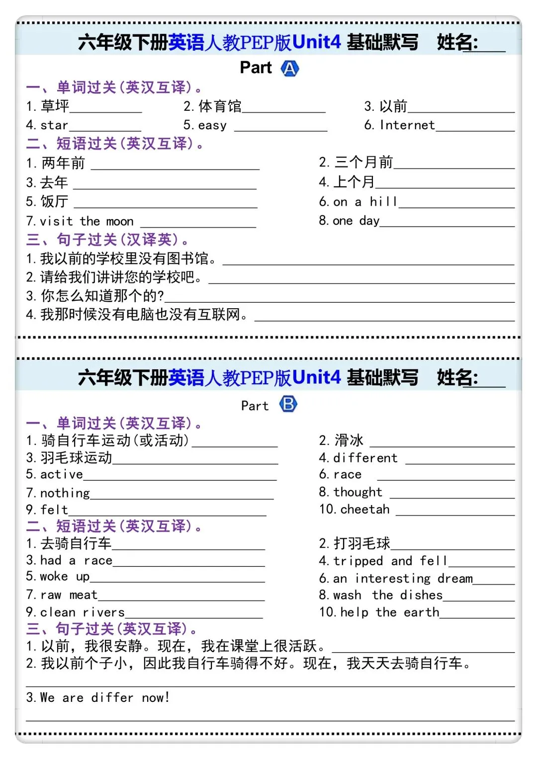 -      【免费下载】四年级(下)英语 Unit1-6 默写纸《人教版PEP》,PDF电子版,共7页,可打印
