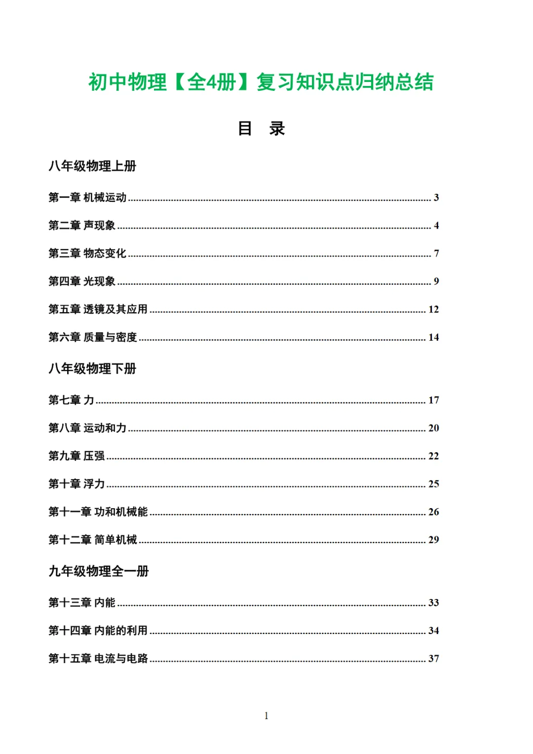 【免费下载】2025年初中物理【全4册】总复习知识点汇总和公式大全,PDF电子版,共64页,可打印