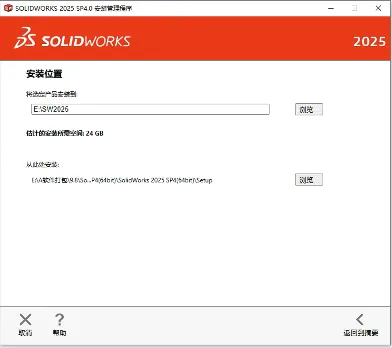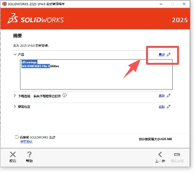 13.产品选择完以后,点击安装位置的更改,这里我把他放在了D盘SW2025文件夹下,你也可以放在其他位置,但是得是英文的路径