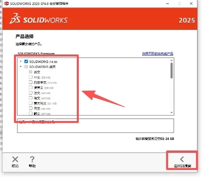 11.看看出现如下界面,勾选solidworks主程序和语言的简体中文,其他需要什么插件自己勾选,不需要的可以不选