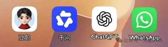 第二排从左到右,第一个是豆包,能陪你聊天、解决问题、规划行程;旁边的千问也是AI智能助手,能帮你查信息、写内容;然后是ChatGPT,擅长复杂的文本处理和逻辑问答;最右边的WhatsApp是国际常用的聊天软件,在巴厘岛用它联系司机、民宿老板都很方便。