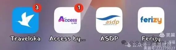 第四排Traveloka是东南亚很火的旅游平台,可查接送机方案也能在这上面比价订车;旁边这个ASDP是印尼的港口服务应用,买船票或者查轮渡时刻会用到;最右边的Ferizy是印尼本地的出行APP,主打平价打车和租车服务。