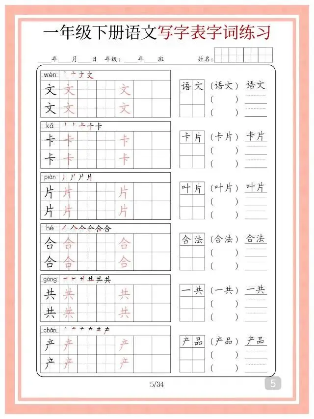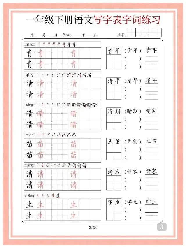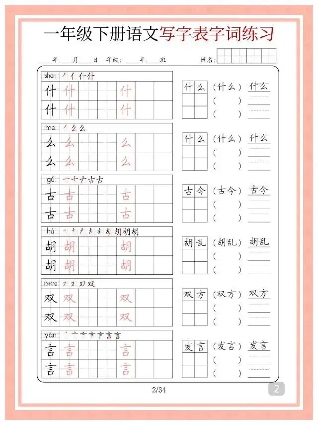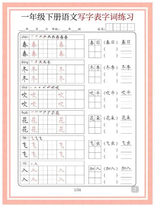 这份一年级语文下册写字表字词练习,紧扣课本写字表核心生字,34页内容均以描红+组词形式呈现,笔顺示范清晰、组词贴合低年级认知,针对性训练生字书写与基础字词运用,可以巩固写字基础、积累课内字词的实用练习资料,适配日常练字和课后基础巩固使用。