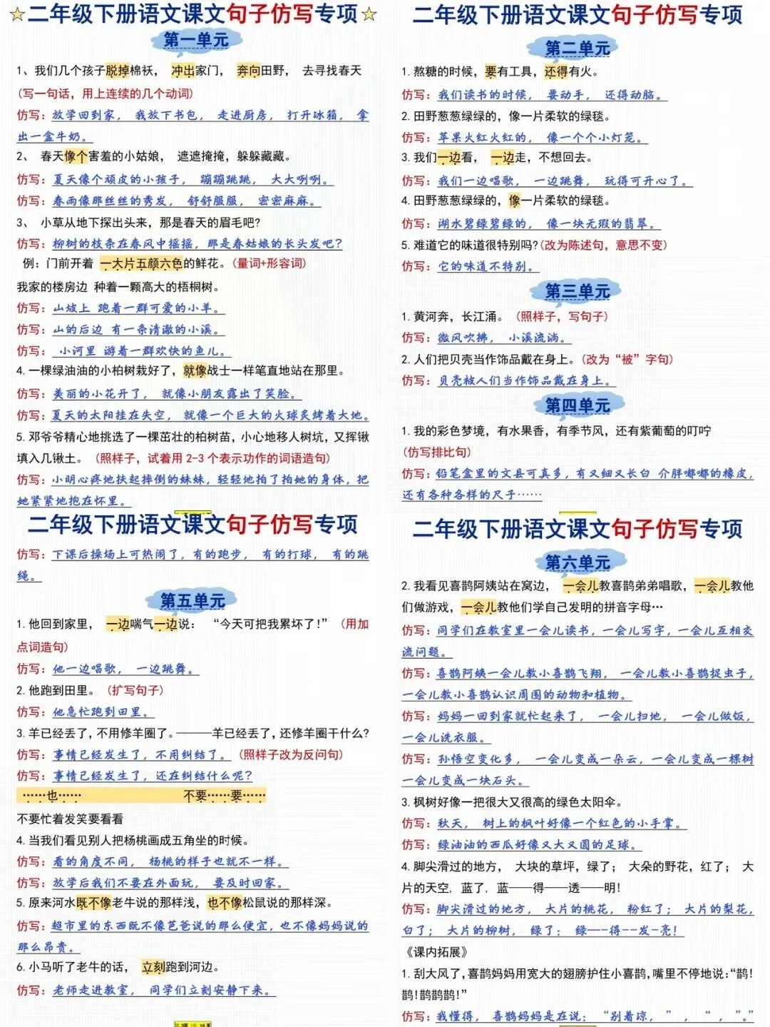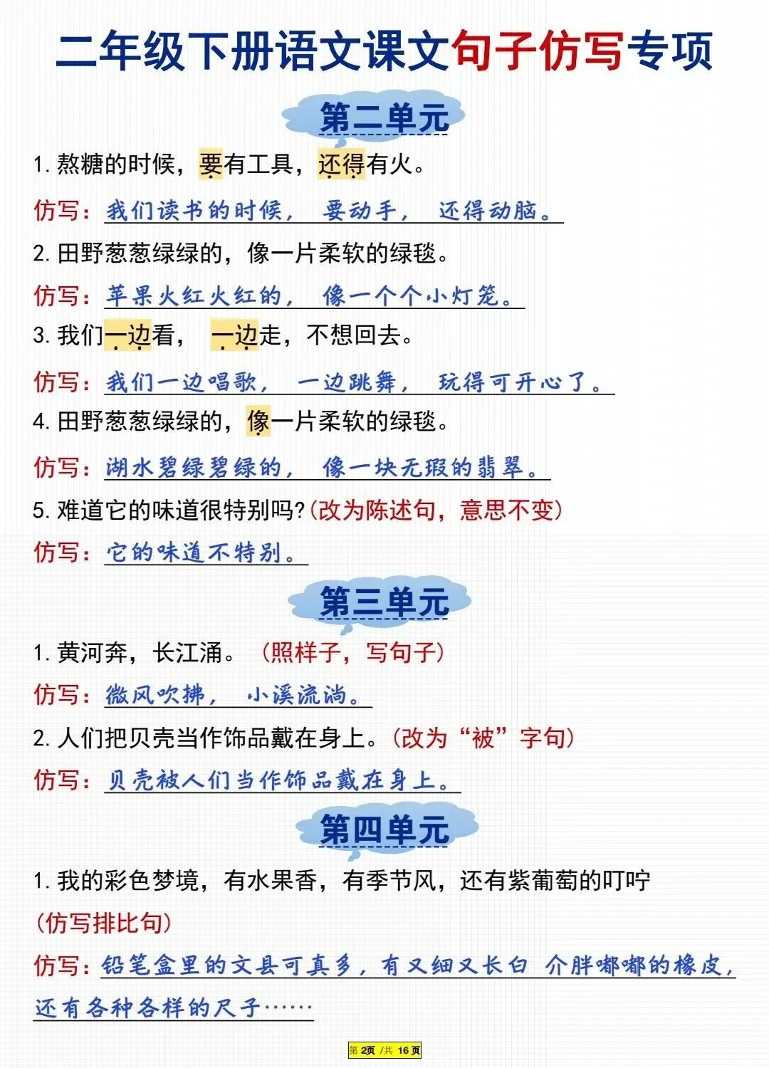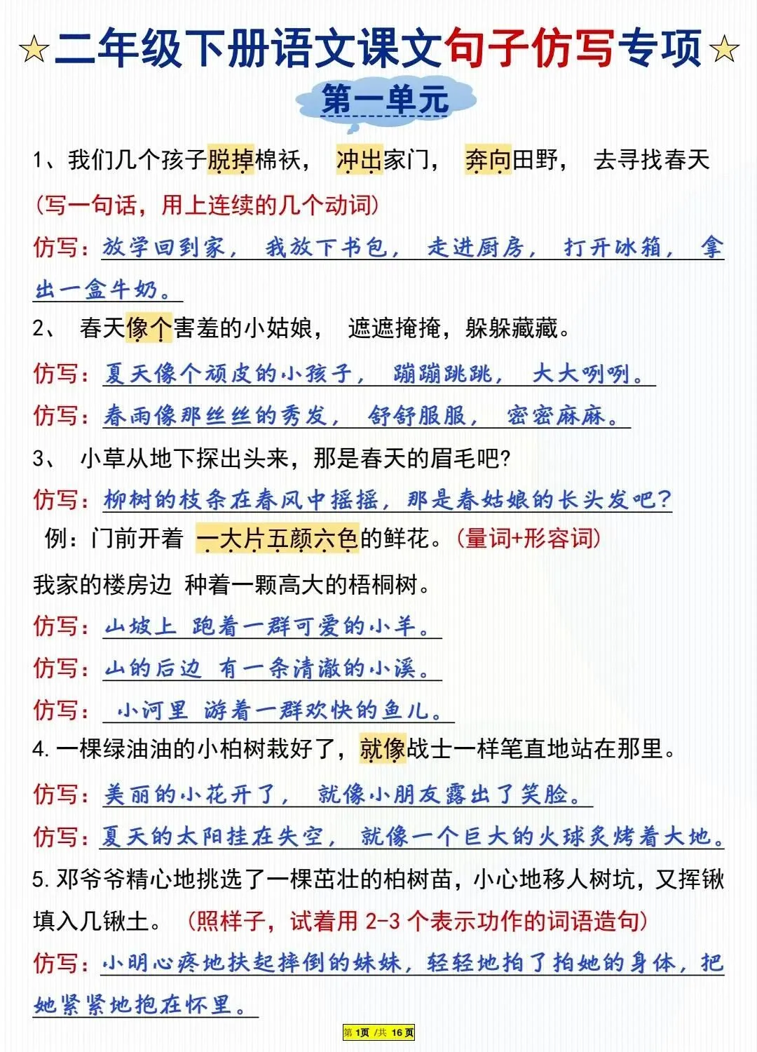 二年级语文课文重点句子仿写专项(电子版可打印) 今天晴天妈妈爱学习;给大家分享:二年级语文课文重点句子仿写专项(电子版可打印)每天持续分享更多的优质学习资料。 以下为部分截图,具体看完整PDF文件 (温馨提示:文末有电子版领取方式) 完整电子版: ①:在公众号对话框中回复:3325 (不是在“留言”中发数字)