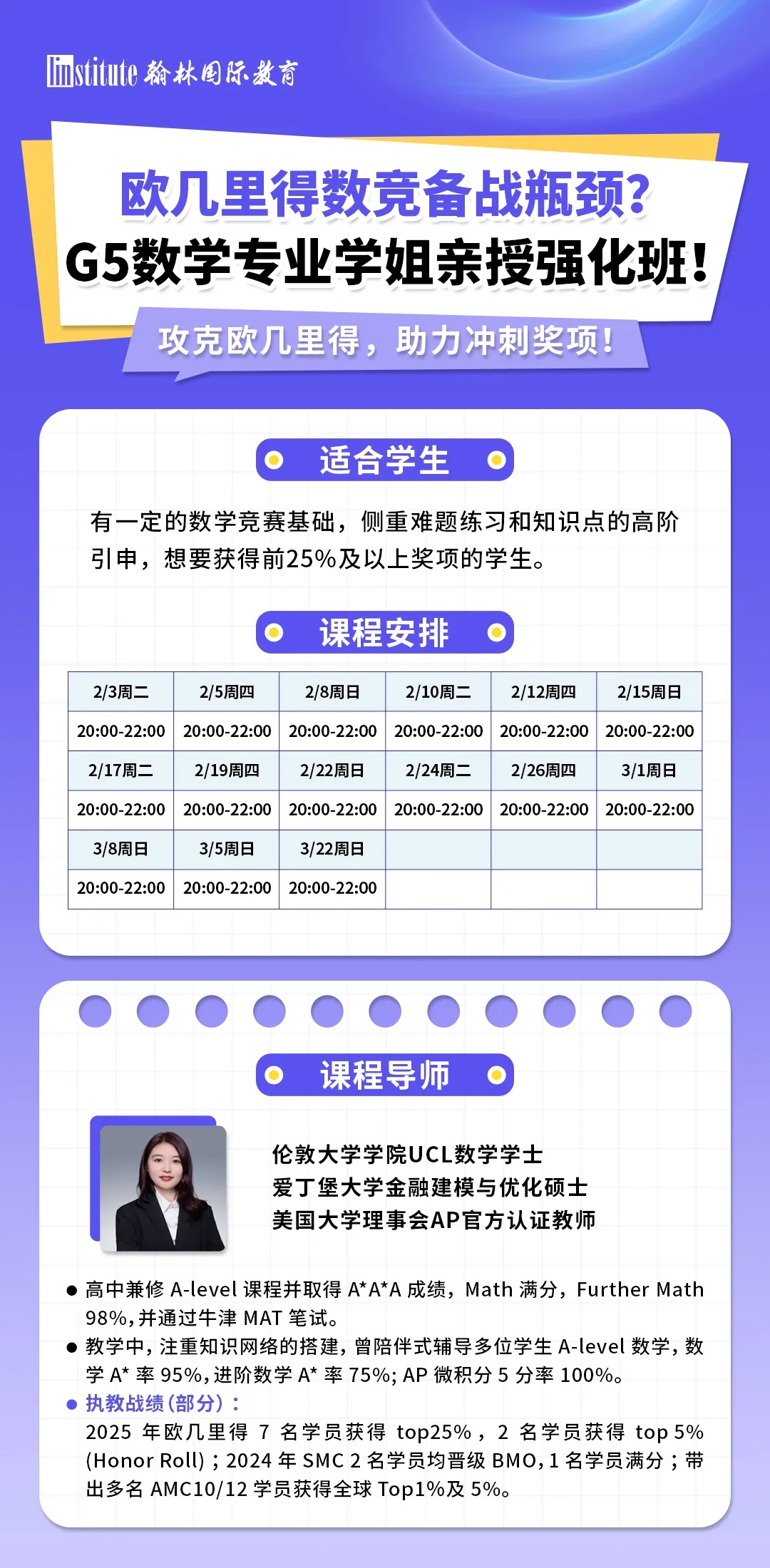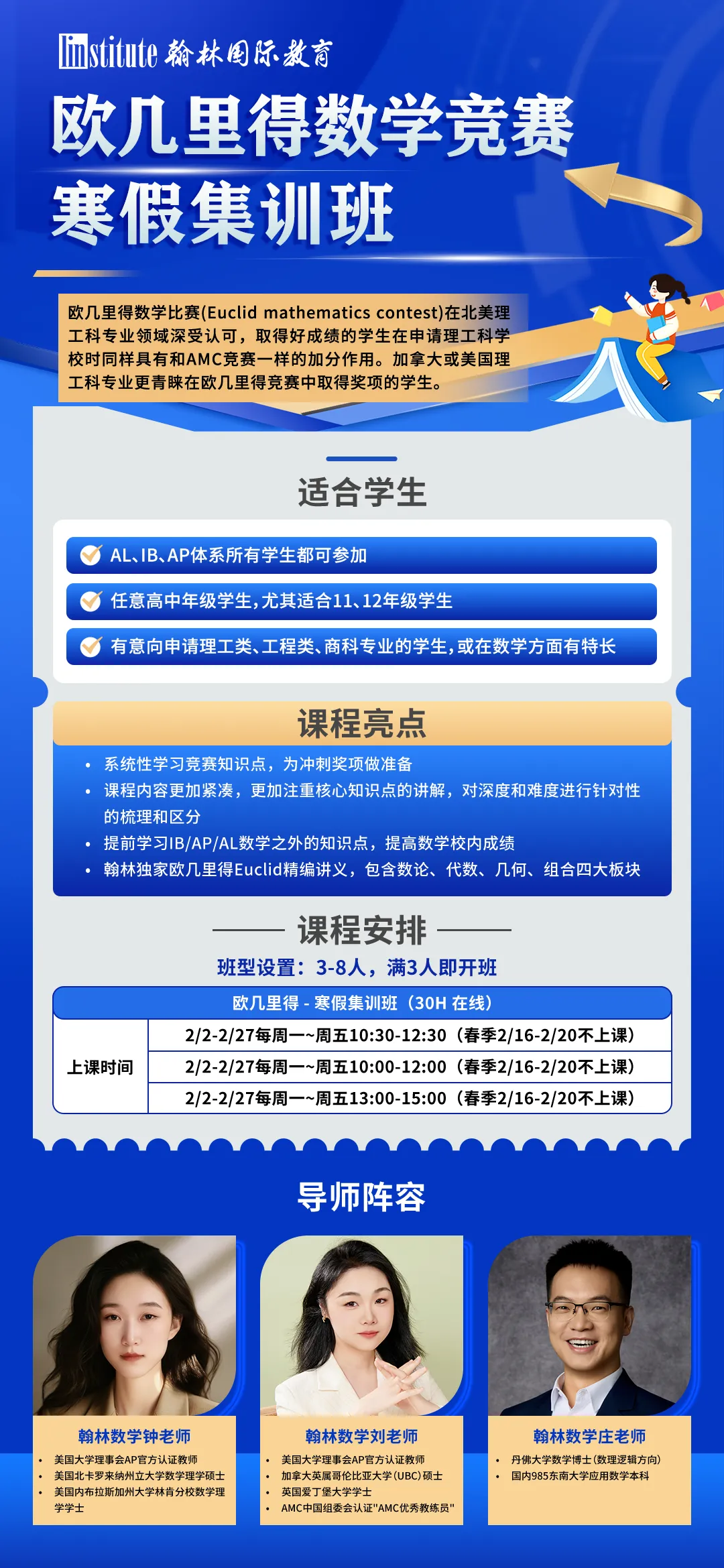 翰林针对2026欧几里得竞赛开设了寒假培训课程,3-8人小班制,名师教学,于翰林报名学生可享有奖学金福利!!
