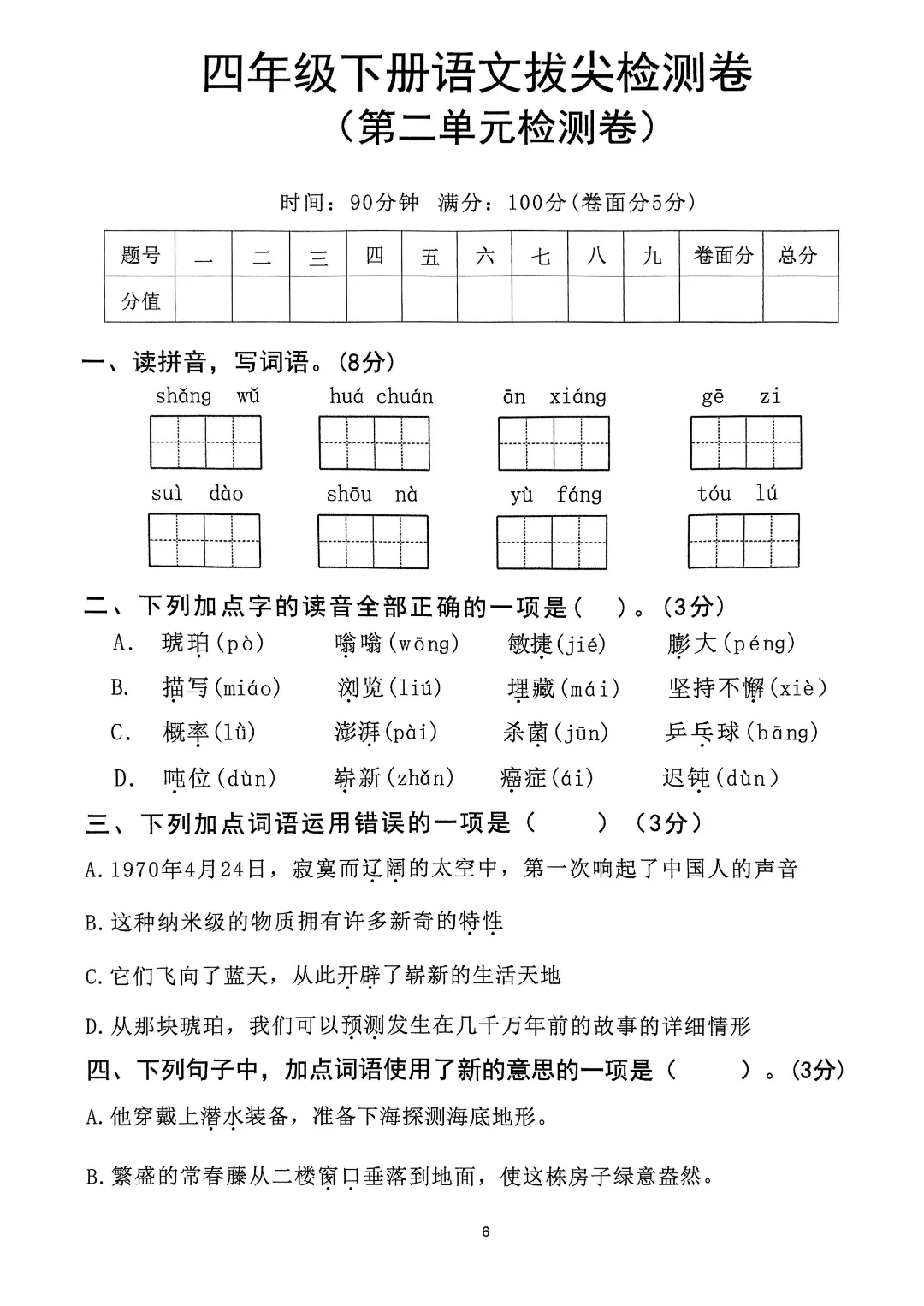 🌟今日给大家分享的:26年春四年级下册人教部编版语文 《1-8单元拔尖测试卷》(8套附答案)电子版可打印