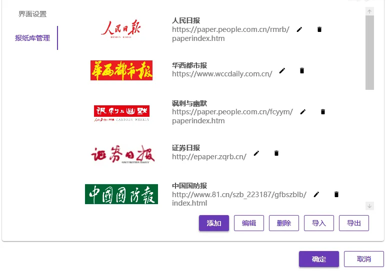 导入或添加:可以导入作者分享的报纸库,或点击“添加报纸”,输入名称、网址,并可选配上标题截图。