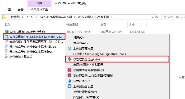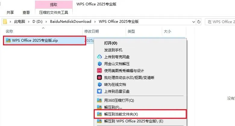 1、下载WPS 2025软件安装包到电脑上,右键选择【解压到当前文件夹】。