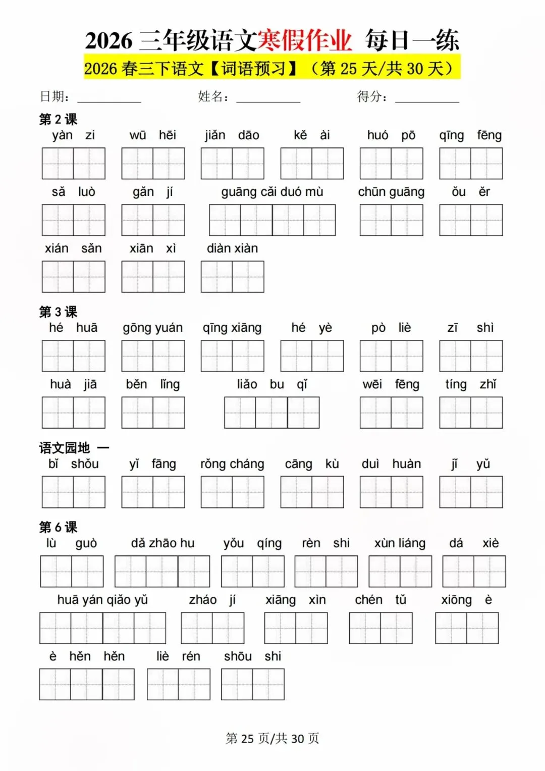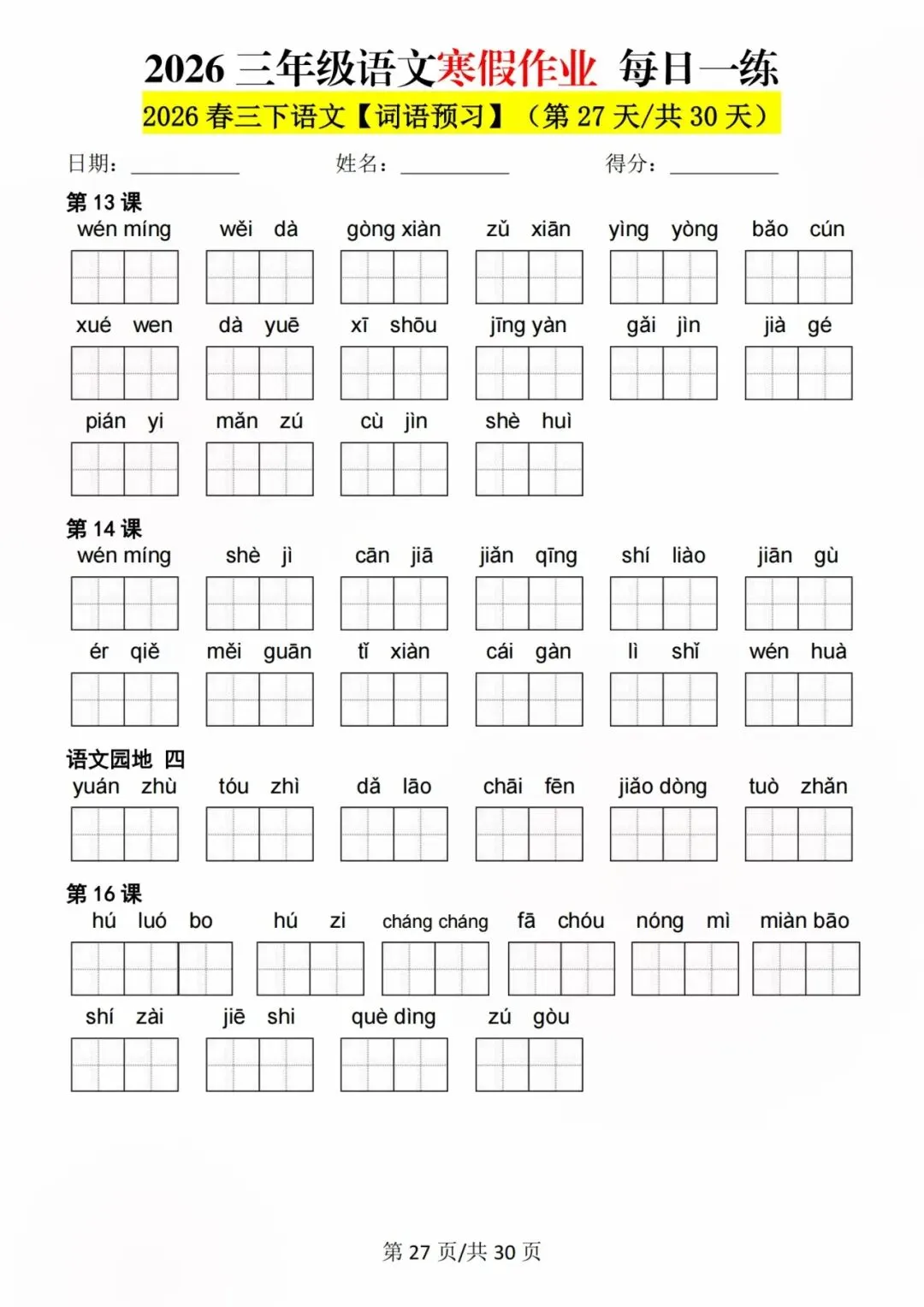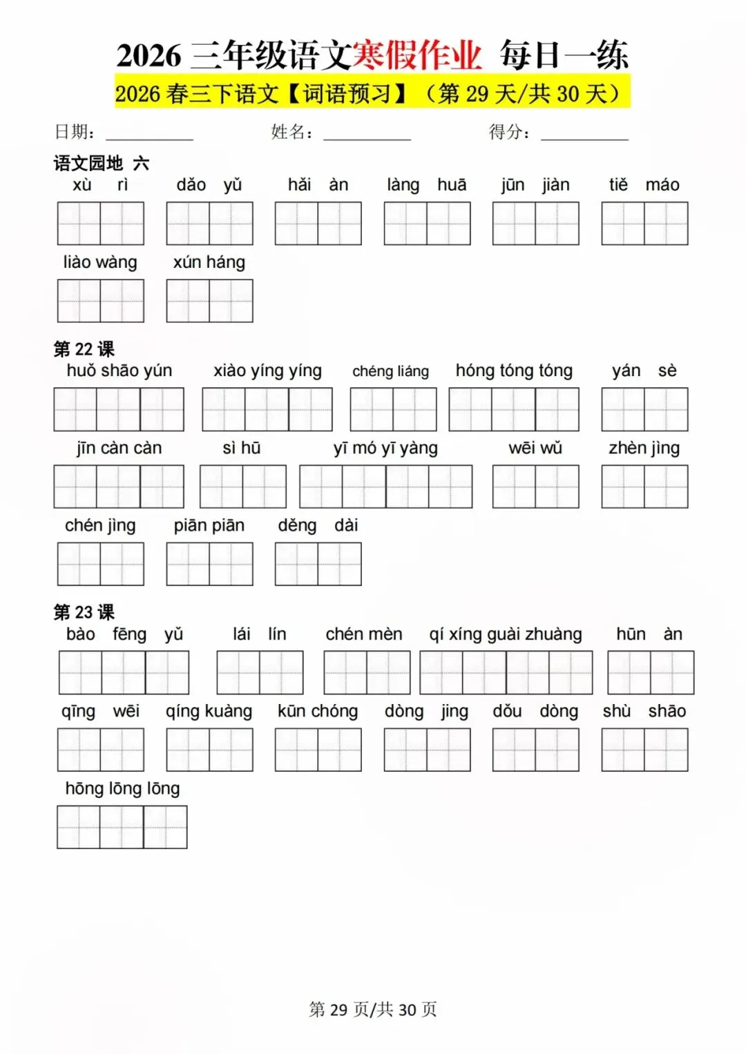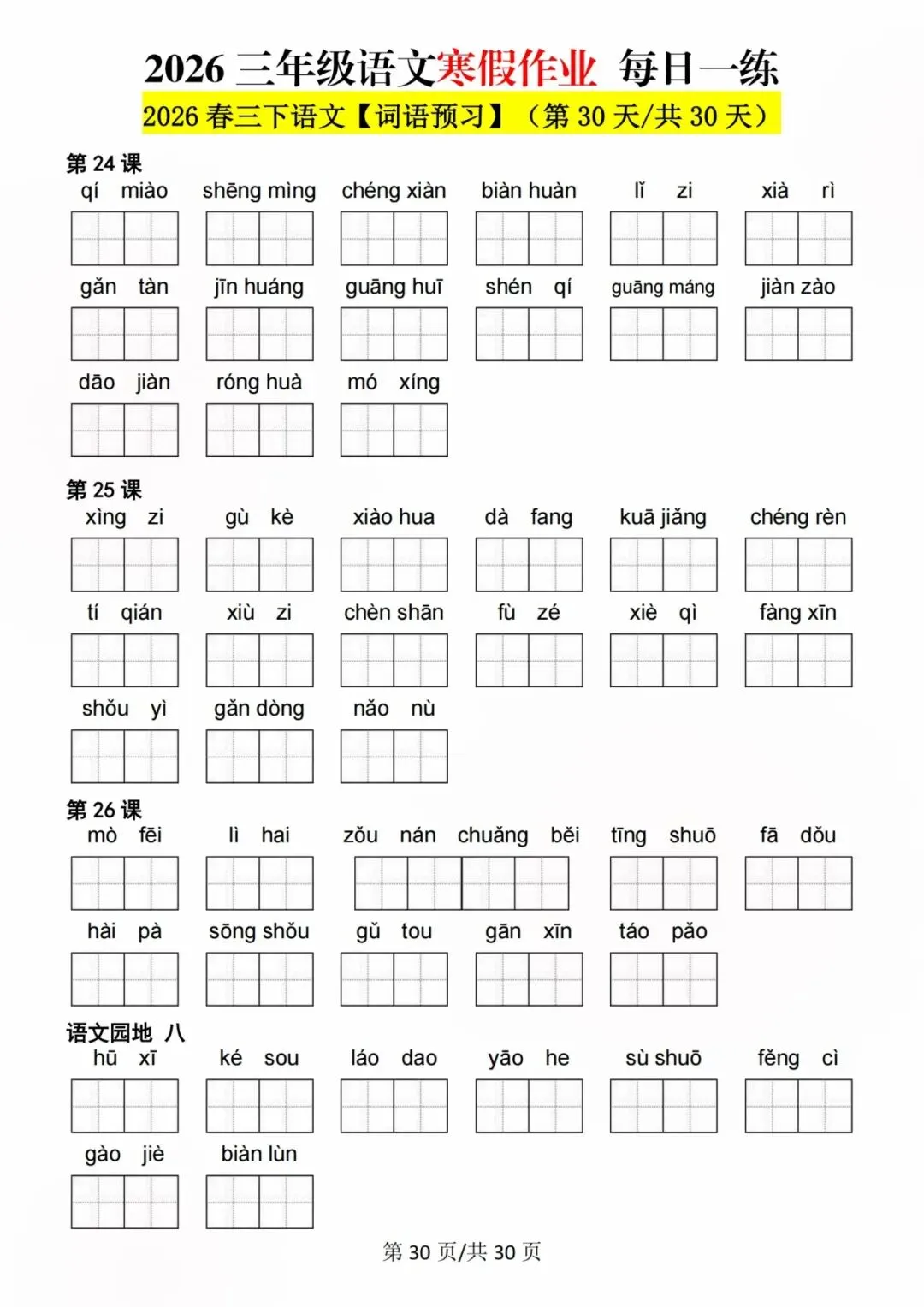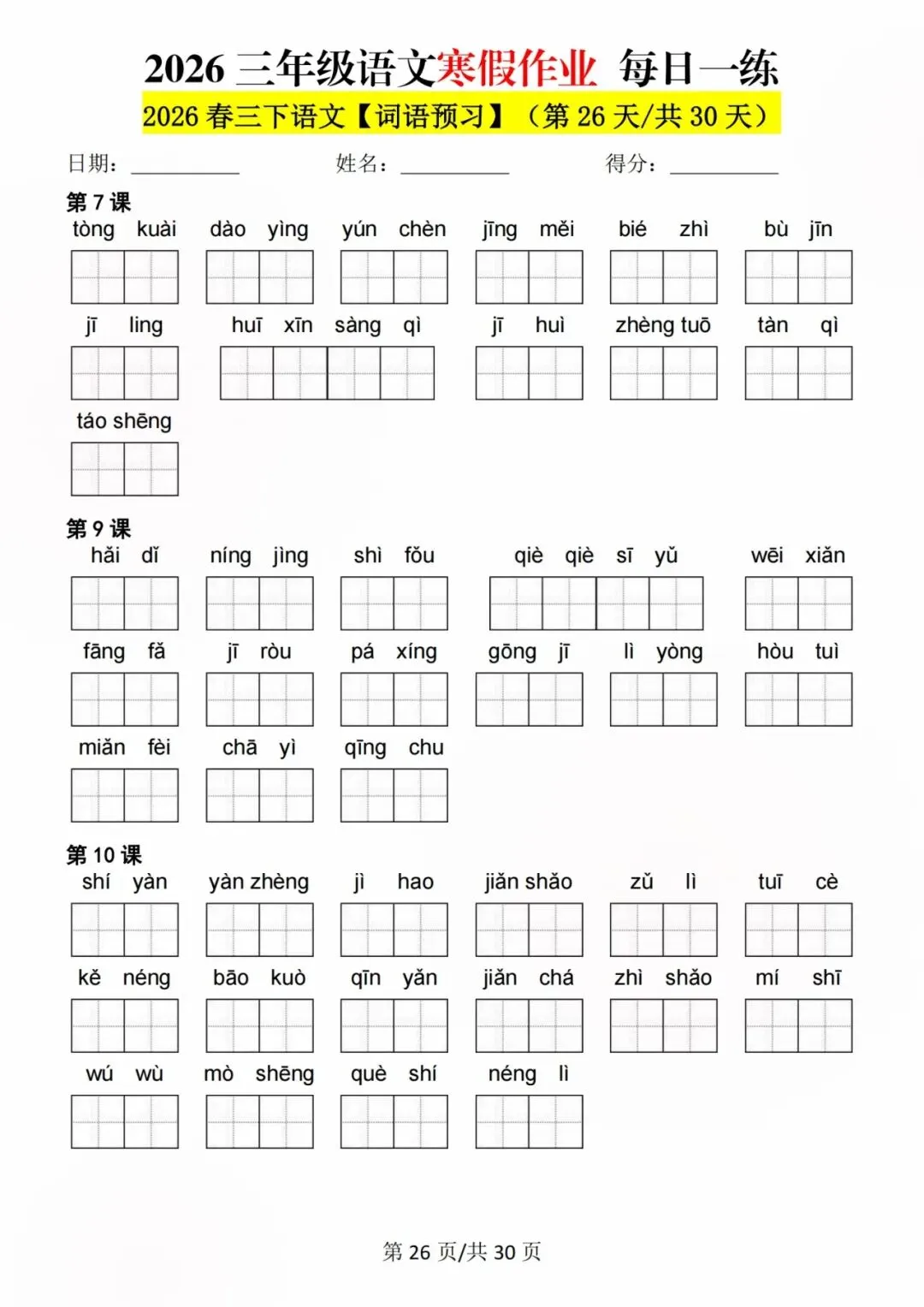 26新三年级语文寒假预习每日一练,电子版可打印可下载