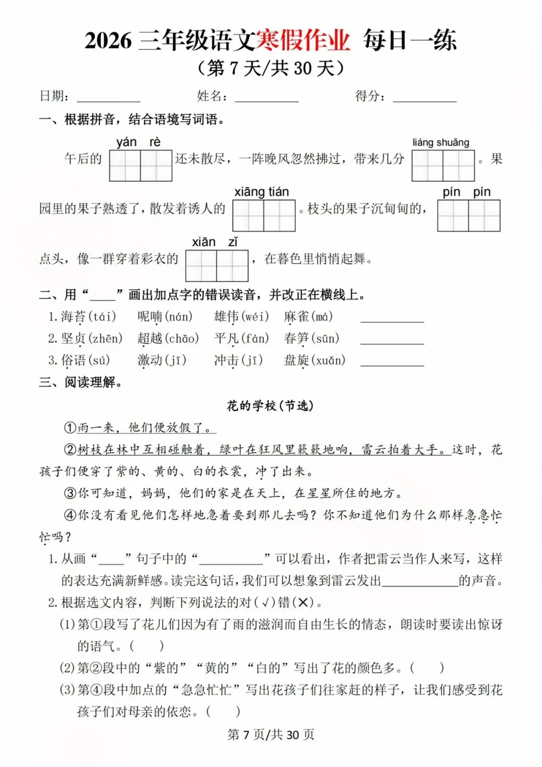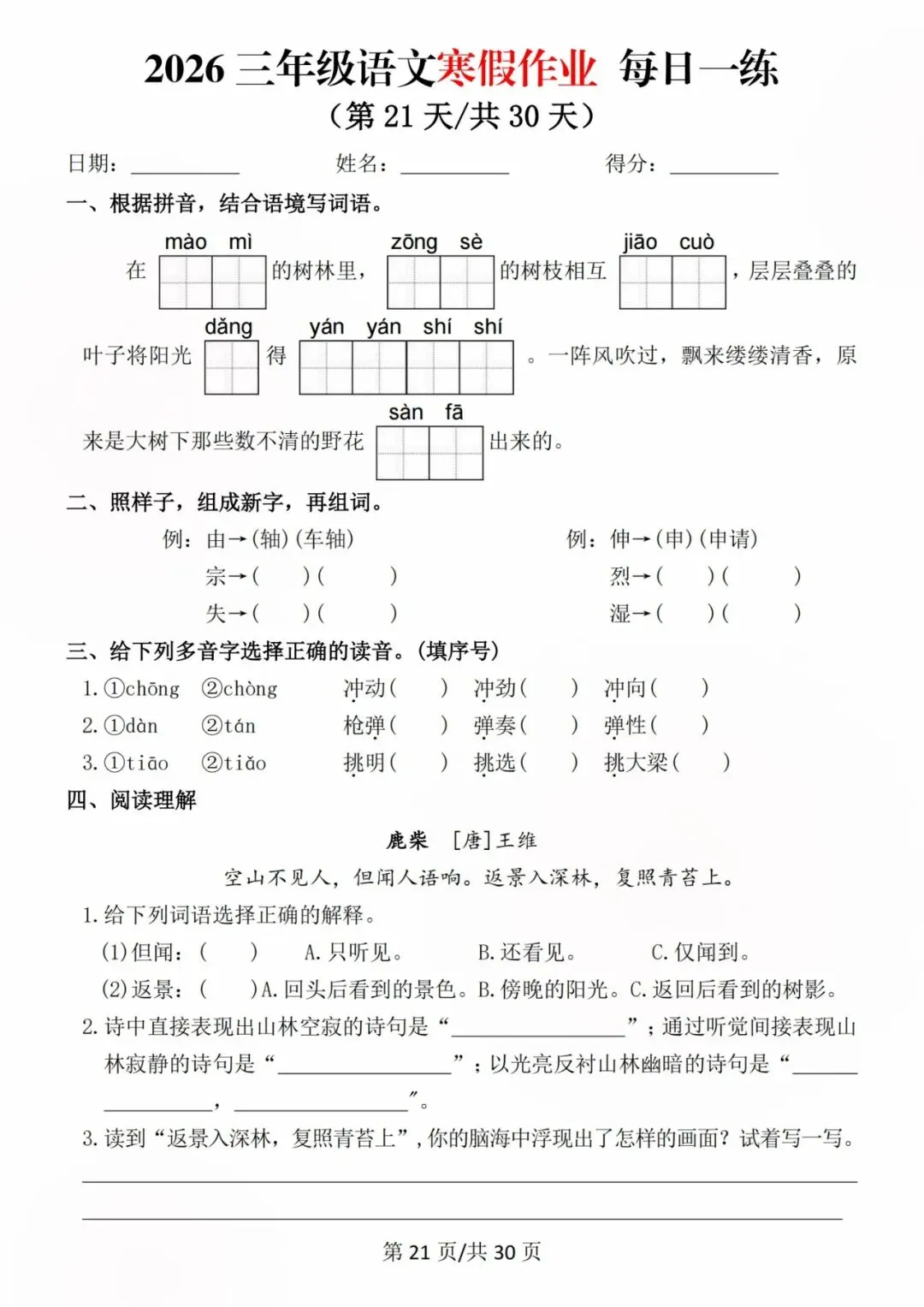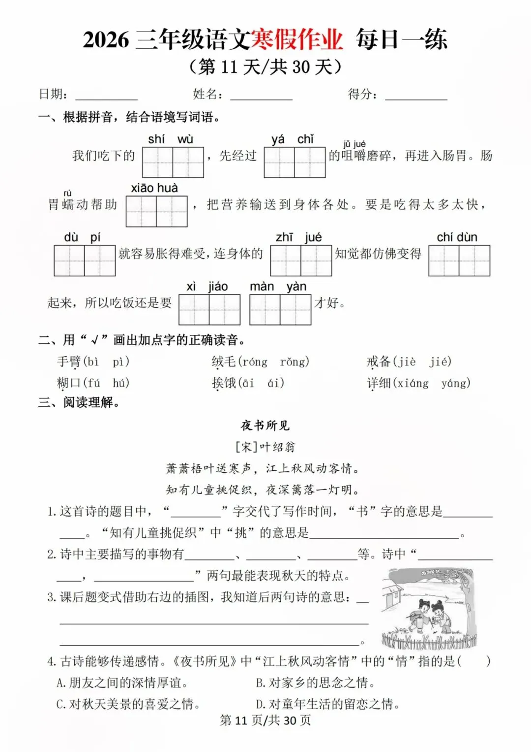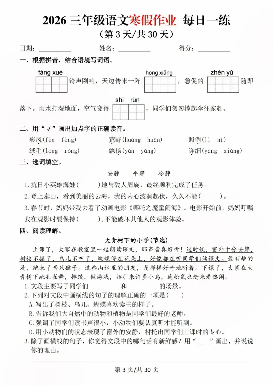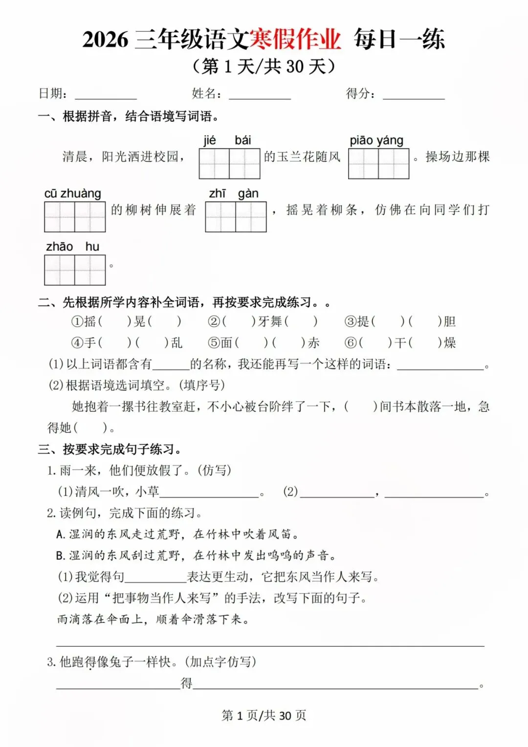 26新三年级语文寒假预习每日一练,电子版可打印可下载