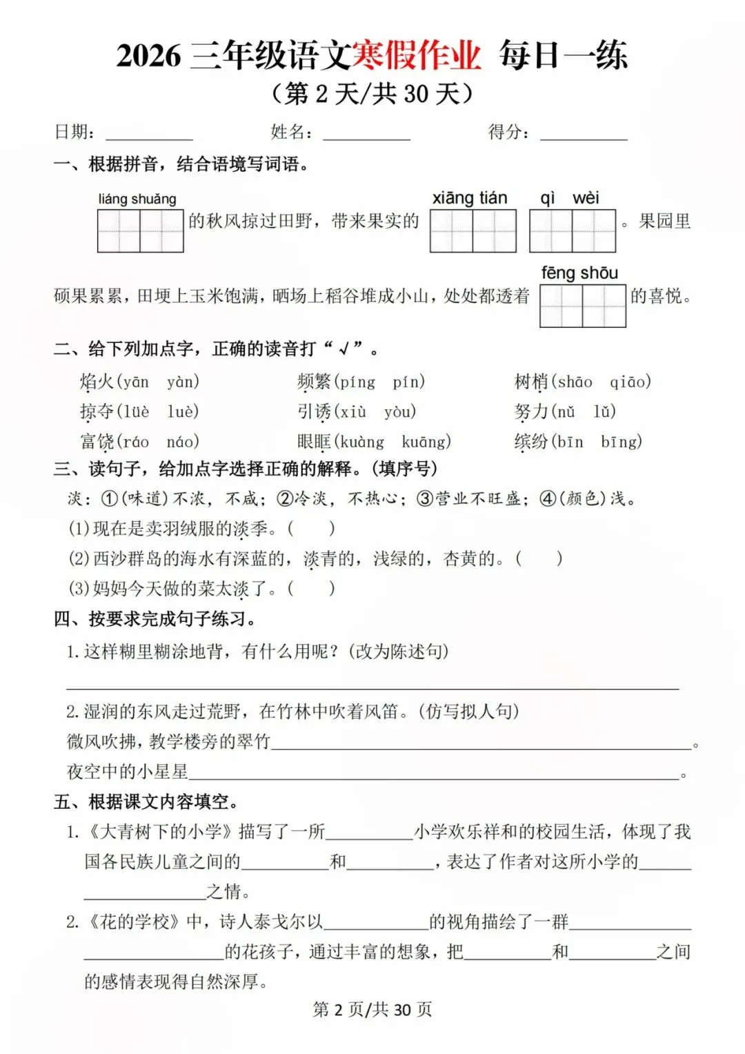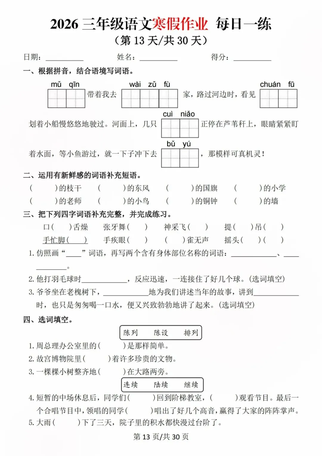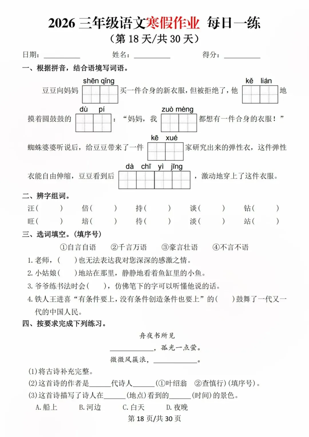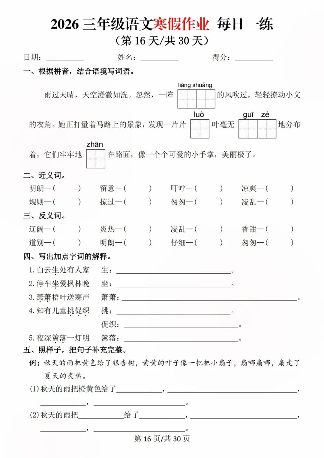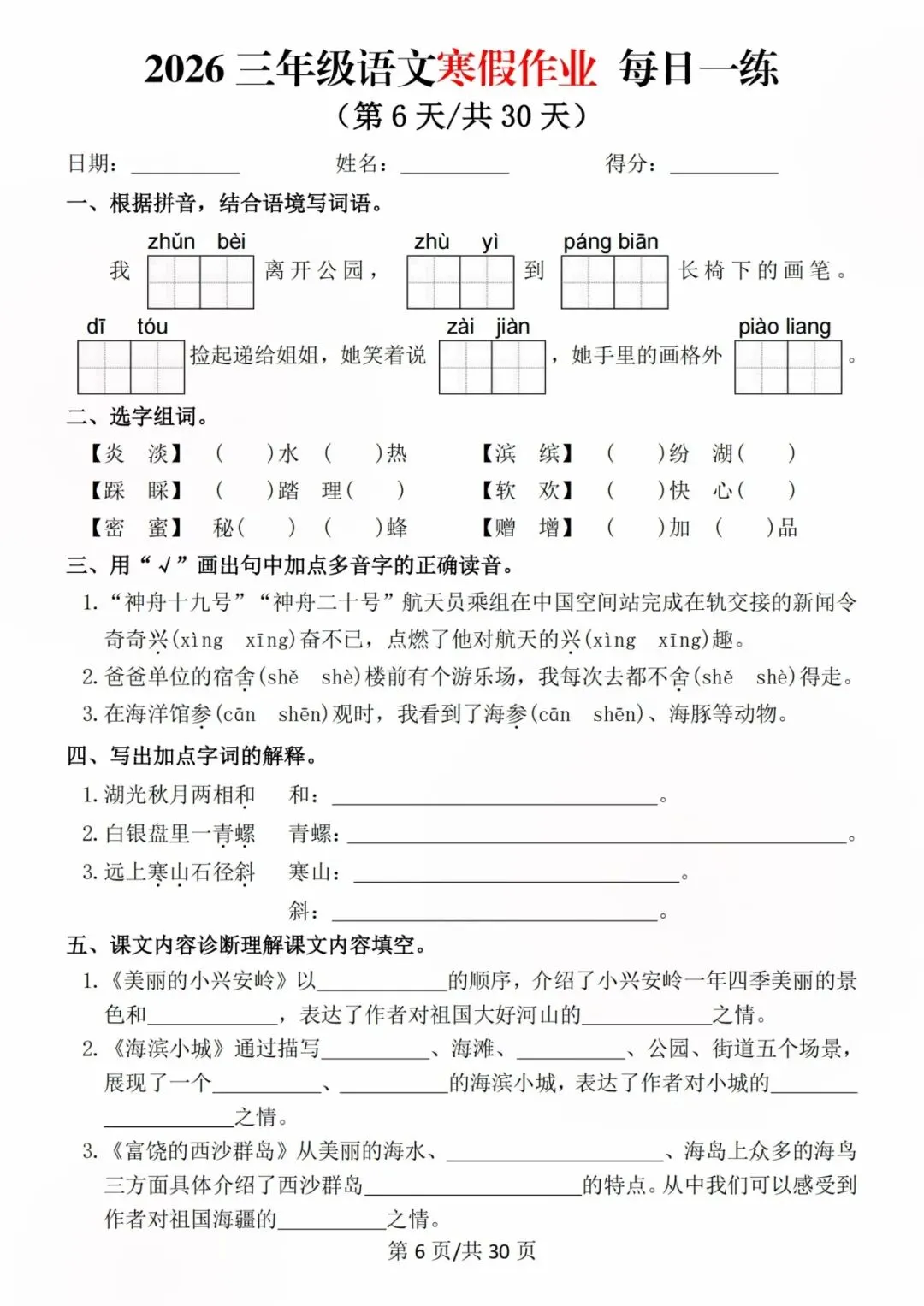 26新三年级语文寒假预习每日一练,电子版可打印可下载