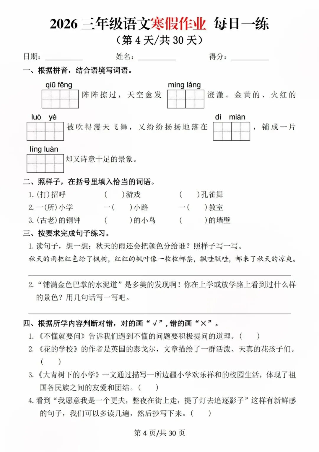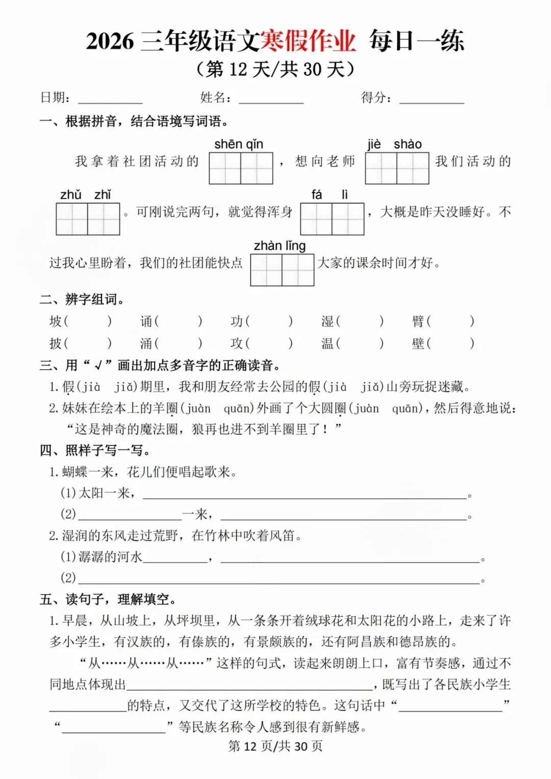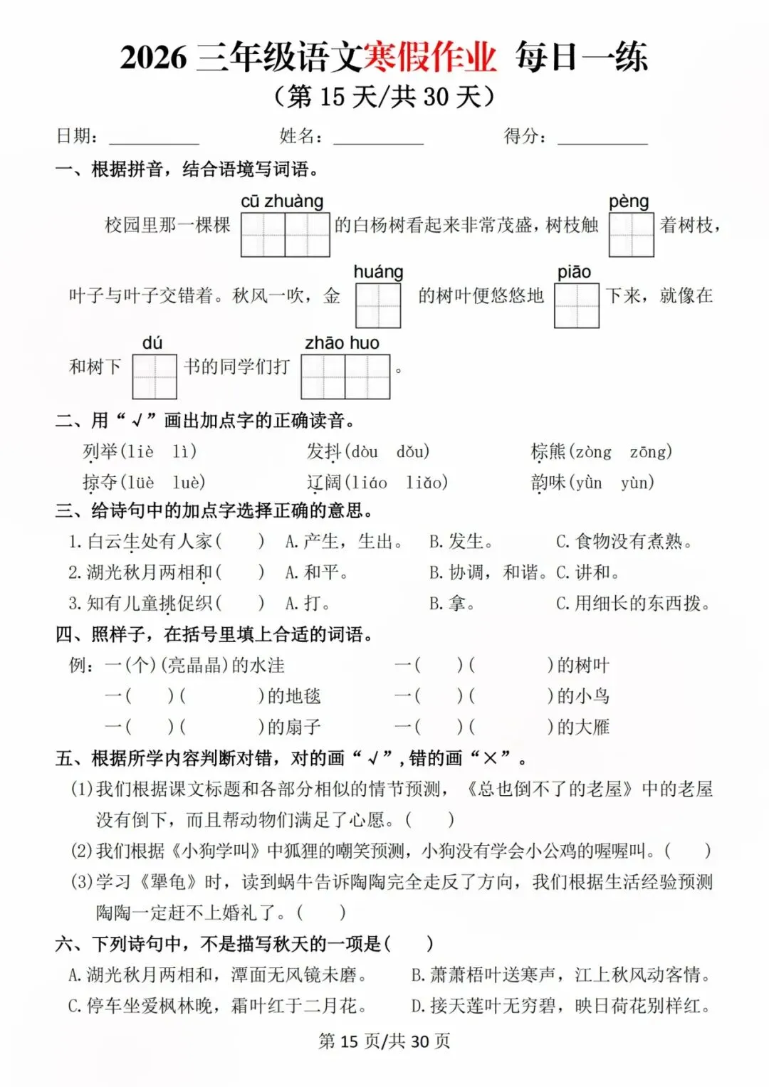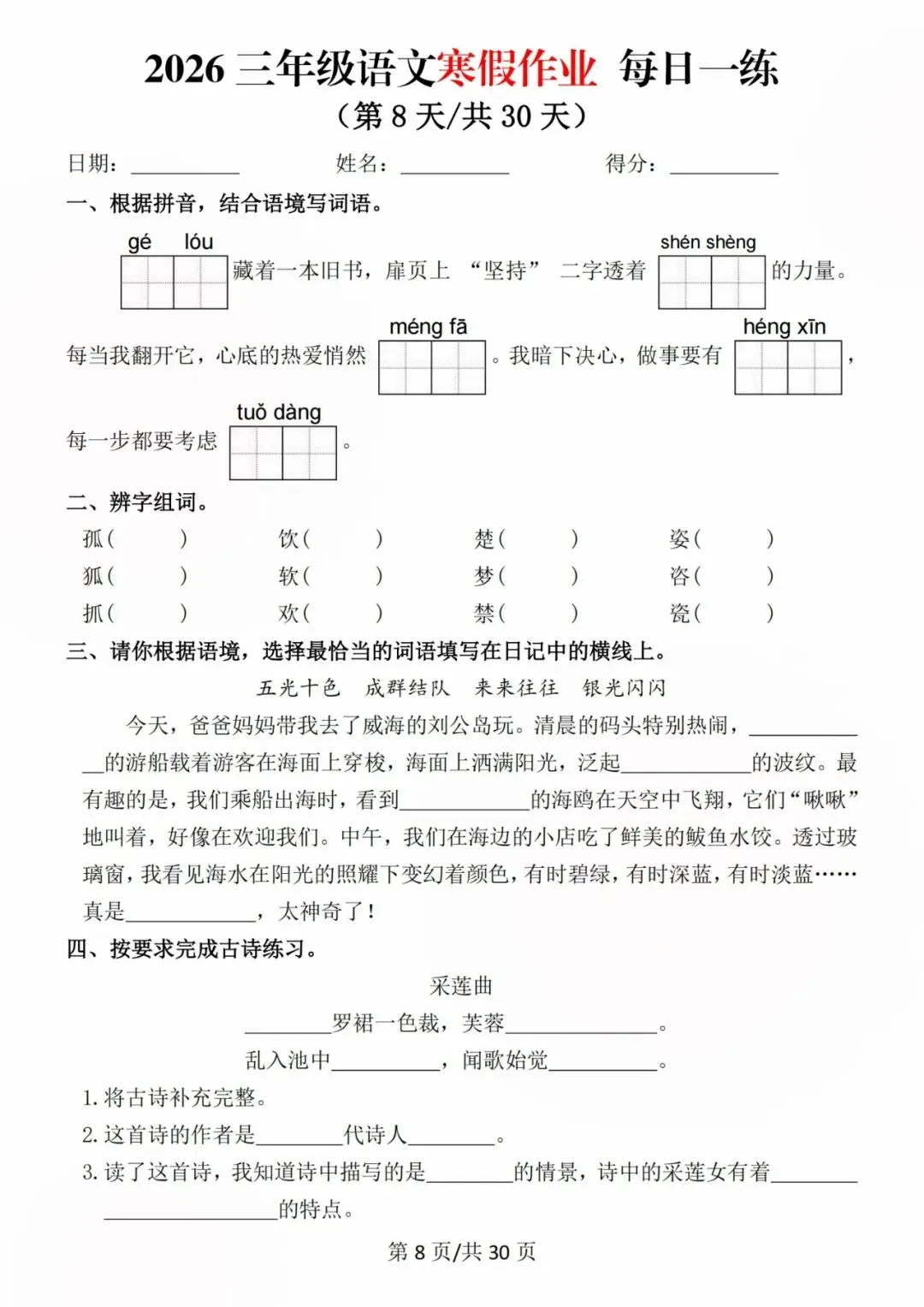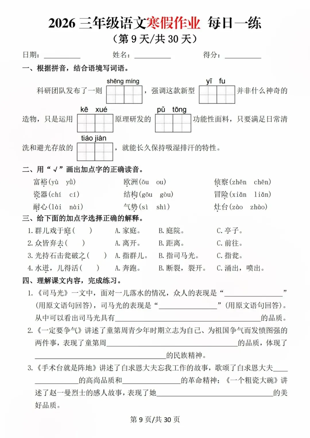 26新三年级语文寒假预习每日一练,电子版可打印可下载