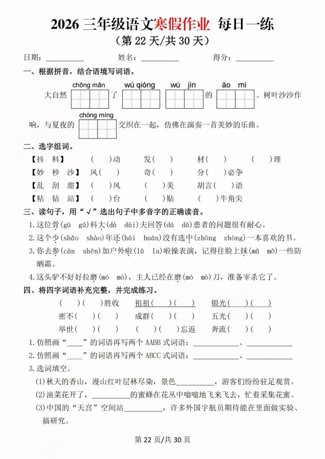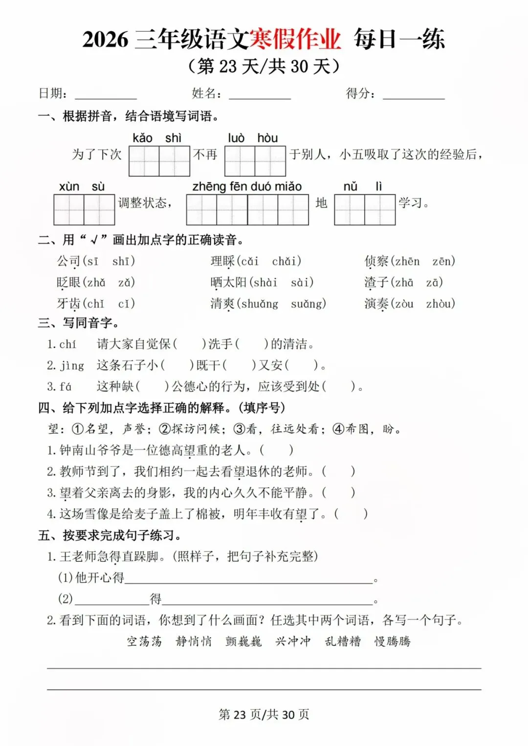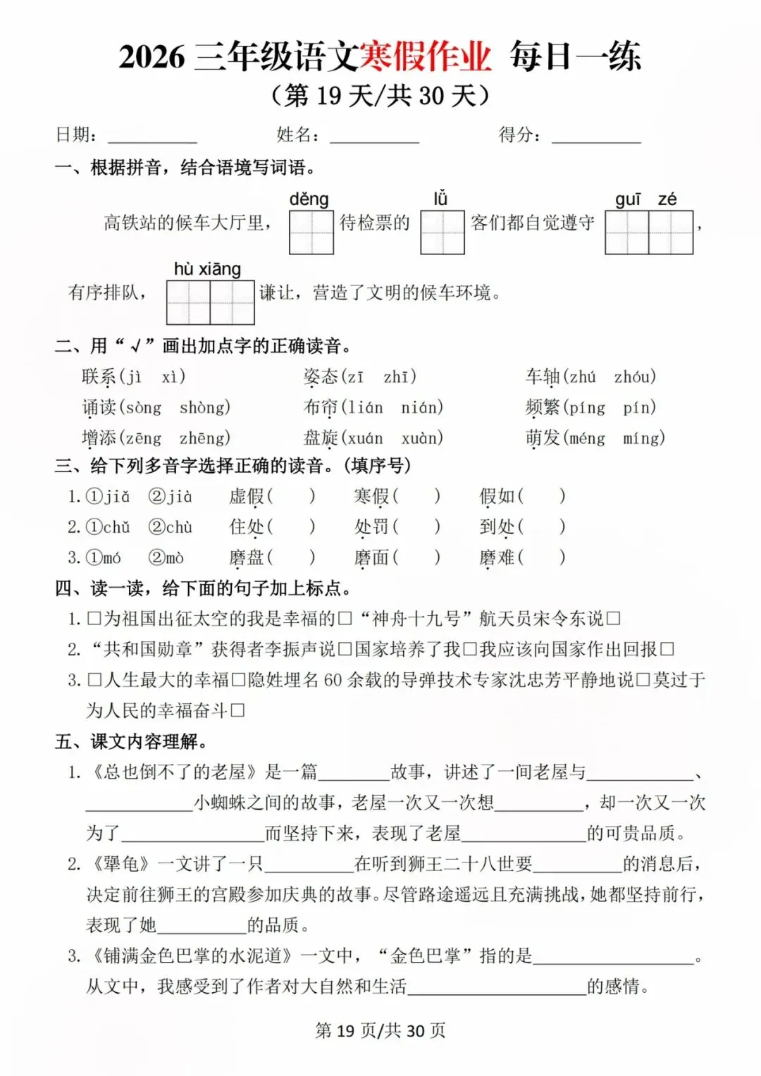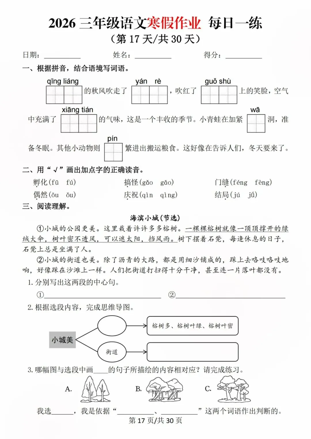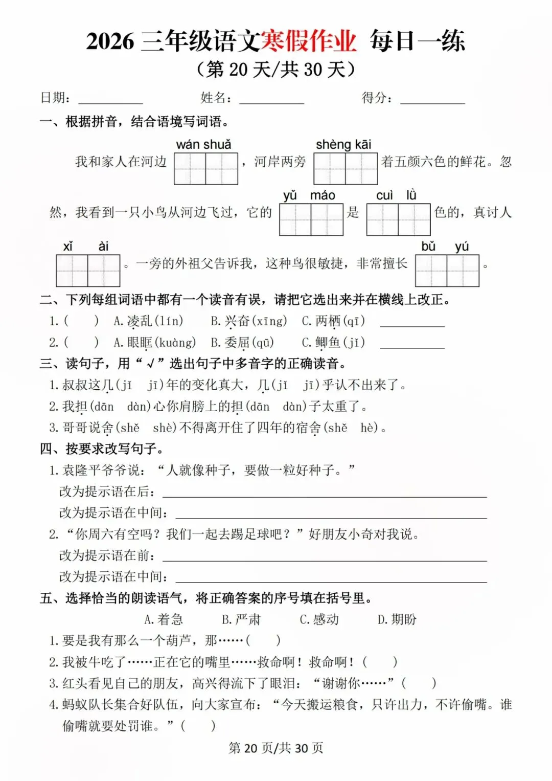 26新三年级语文寒假预习每日一练,电子版可打印可下载