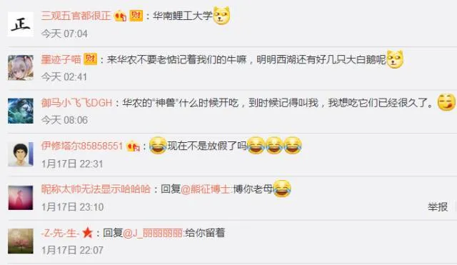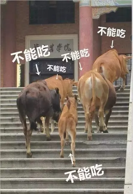 在关心华工鱼的同时,又怎么忘记隔壁华农的牛。“华农的妹子请交出你们的牛”,“华农的黄牛,大白鹅,运动场的走地鸡,农学院的蚕宝宝们,瑟瑟发抖。”