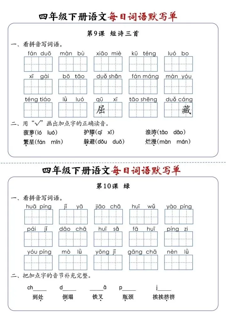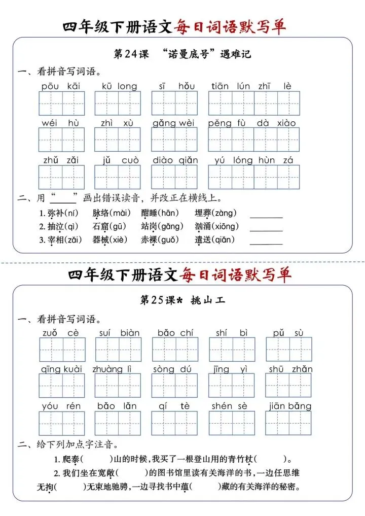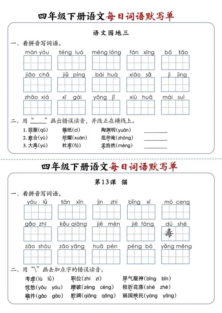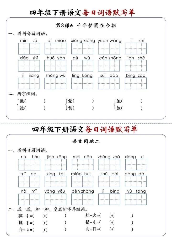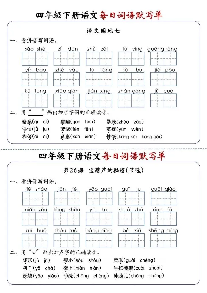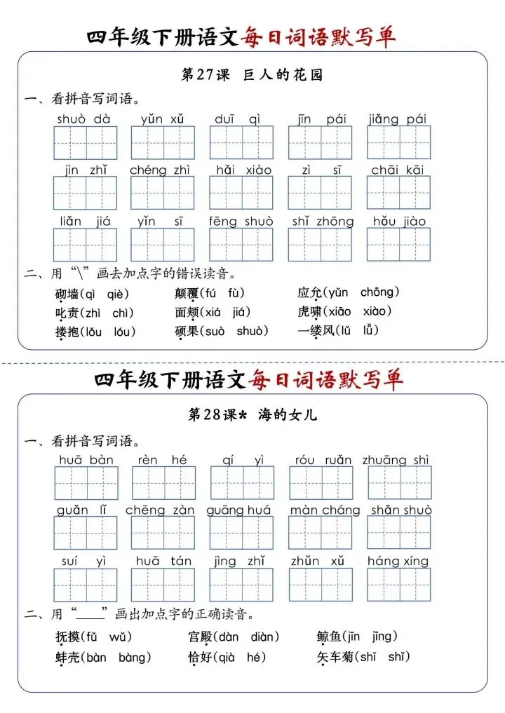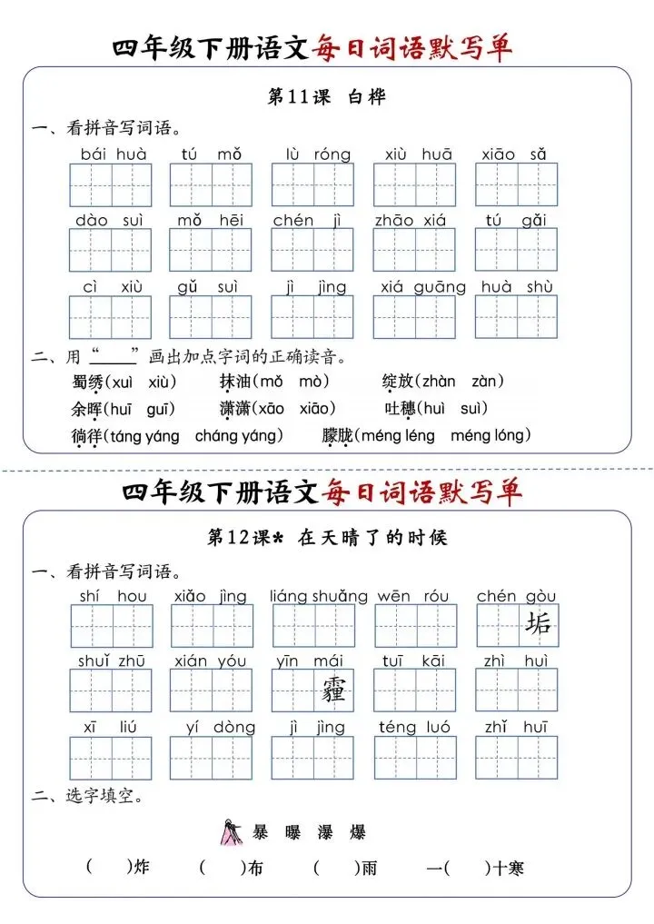 四年级下册语文每日词语默写单(完整电子版可打印)