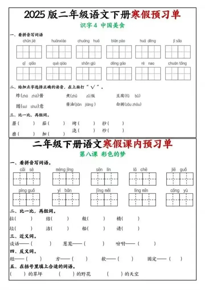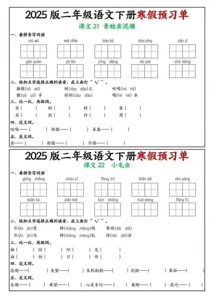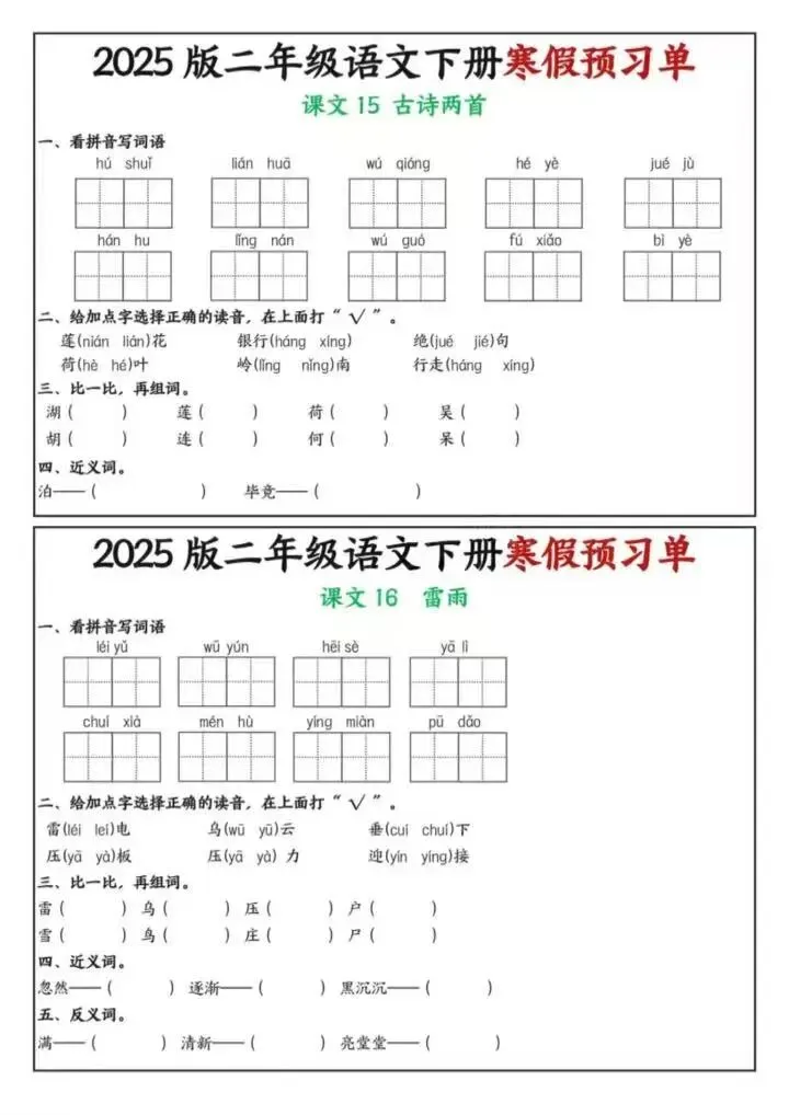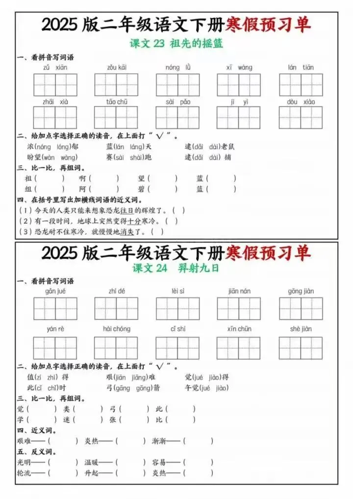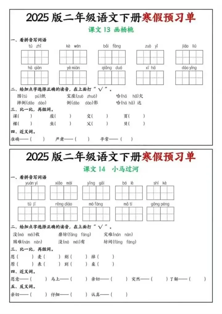 26年春二年级下册语文《寒假课内预习单》电子版可下载打印