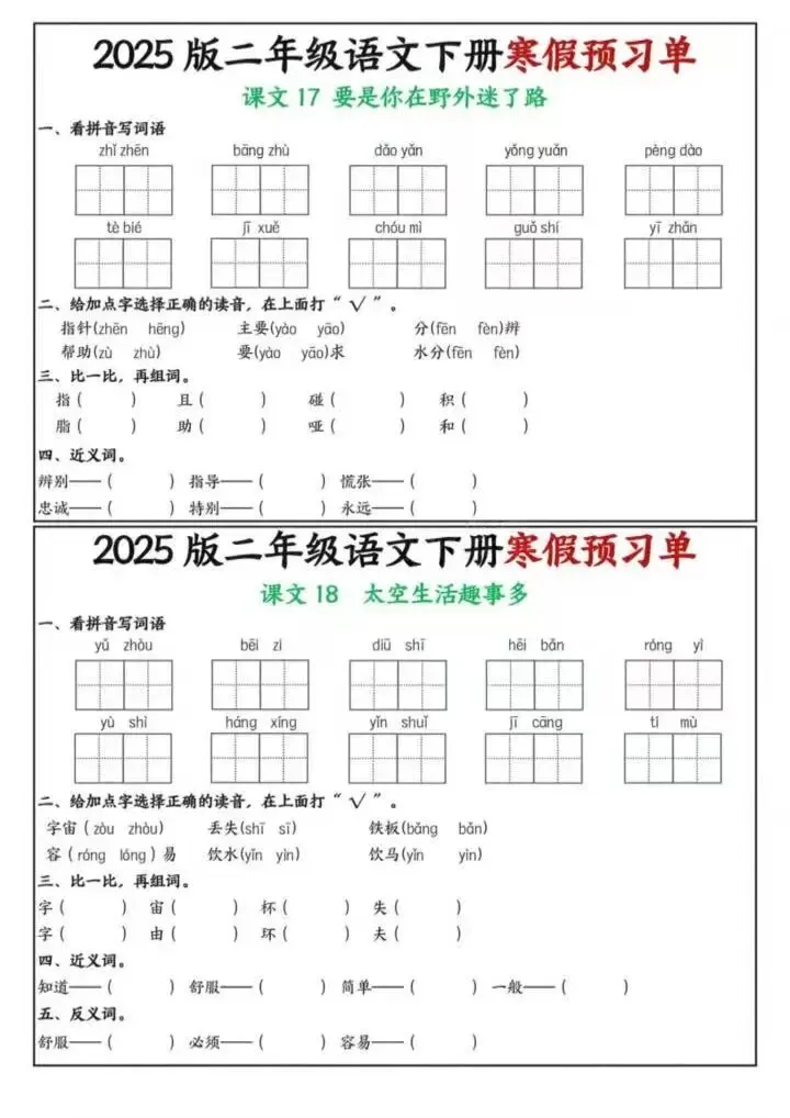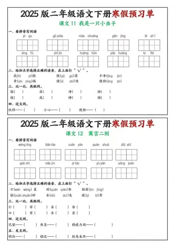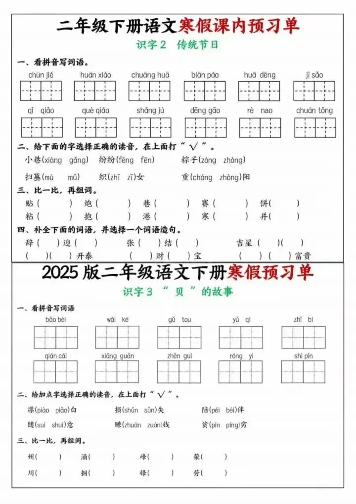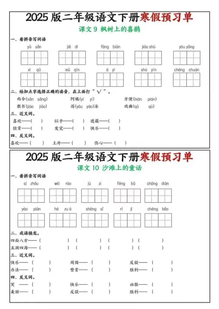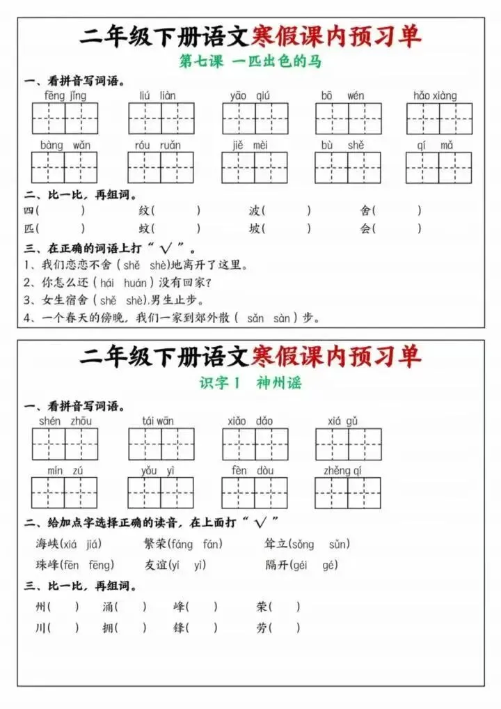 26年春二年级下册语文《寒假课内预习单》电子版可下载打印