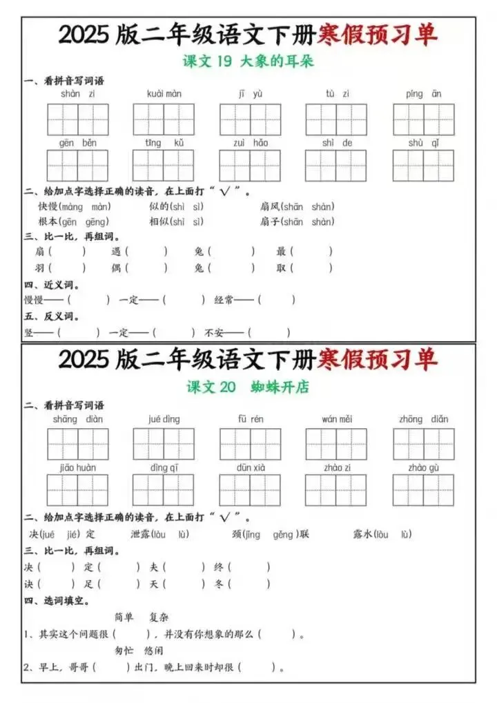 嗨大家好!我是聪麻,今日分享26年春二年级下册语文《寒假课内预习单》电子版可下载打印