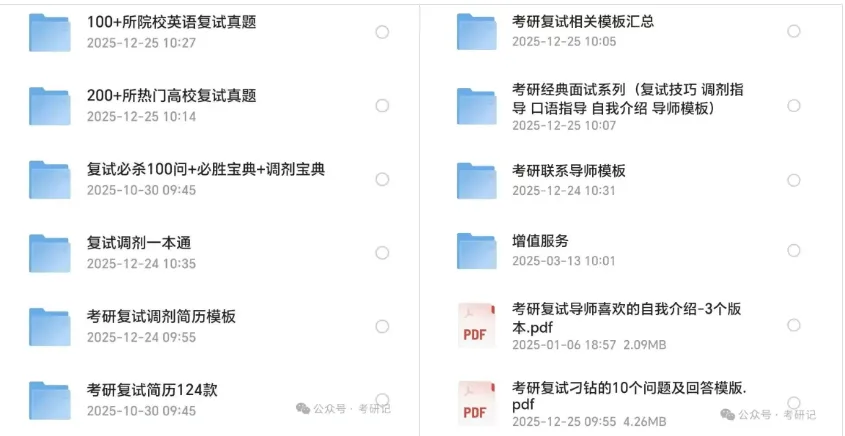 考研复试历年真题+自我介绍、简历模板(电子版pdf) 星光不问赶路人,时光不负有心人。 Hello! 今天给大家带来 考研复试历年真题+自我介绍、简历模板 领取方法往下翻至文末哦! 本期文件展示: 领取方式: 点击下方卡片,关注公众号 2. 回复关键词:复试 5分钱打印资料,可以点击下方 5分钱打印 如果资料失效,后台回复,看到后会补发!