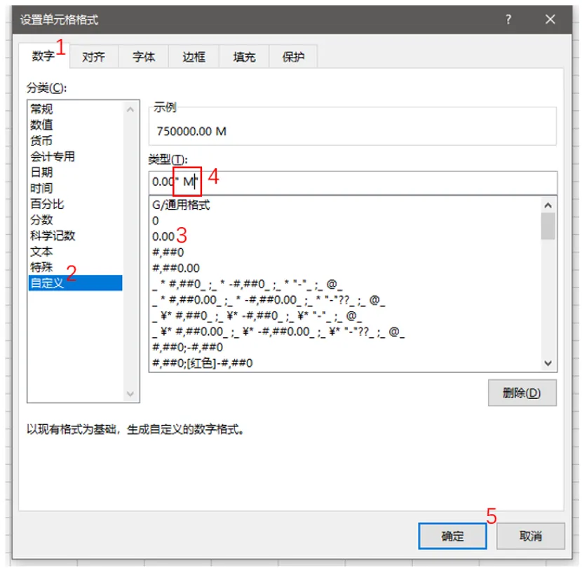 根据一般原则,设置数据单元右对齐,而文字单元左对齐。我们还可以将第2-4列的数据转换为图1(b)中以兆(M)为单位的数据格式。将各个数据除以106后,鼠标左击选中这3列数据,右击选择“设置单元格格式”。如图3所示,选中“数字”标签栏,在“分类”中选择“自定义”,在“类型”中选择“0.00”,然后在文本框中的0.00后填写:“ M”。完成全部操作后点击确定。