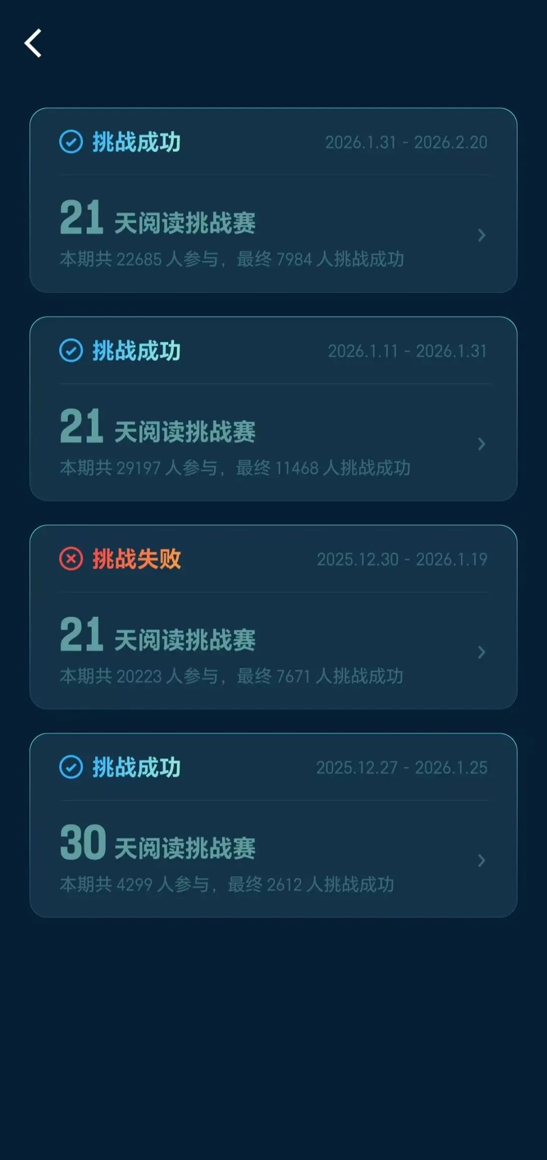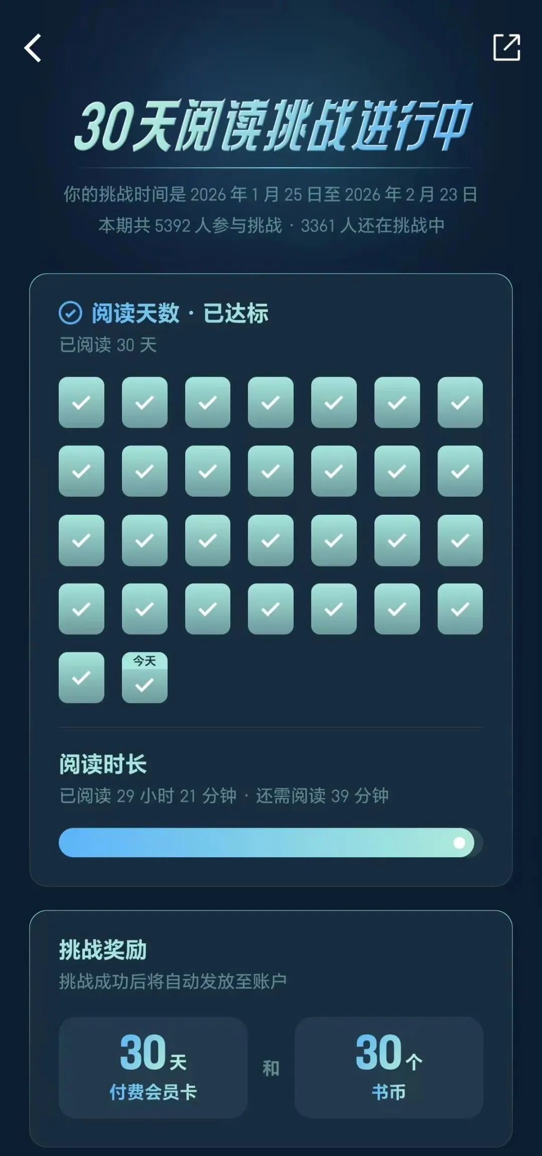 06丨微信读书APP 去年下半年,我得到APP的电子书会员到期了;年底,重新用上了微信读书APP。然后看到了这篇文章微信读书APP会员卡兑换最省钱方法,3步解锁永久会员,立马根据步骤解锁了会员。别说,这种赚大发了的感觉真的太好了,哈哈哈哈哈…… 今天是第二个30天阅读挑战的最后一天,还有39分钟的任务需要完成。(没问题的啦~)现在很多时候会听书,不是解读,是听APP读原文,也省得太费眼,这功能真的很赞(过年、旅行都不怕完不成任务)。就是有很多书需要会员才能听全书。 这是目前为止的总纪录。21天阅读挑战赛是不能断的,要连续21天;30天挑战赛完成29天,达到时间长度即可。更多可能还在摸索中。 真心推荐给大家,马年,我们一起阅读吧~ (操作方法请自行阅读独一无二的侠客邢的公众号文章,我放的链接里都有啦,文章里还有其他链接,可自行寻找)