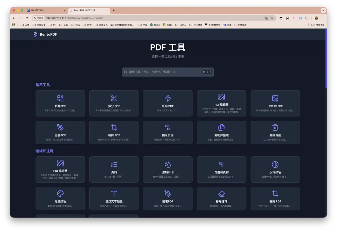 若追求极致轻量、快速上手,仅需处理基础的 PDF 合并、转换、编辑,且个人 NAS 配置一般,推荐选择BentoPDF,占用资源少,隐私性拉满。