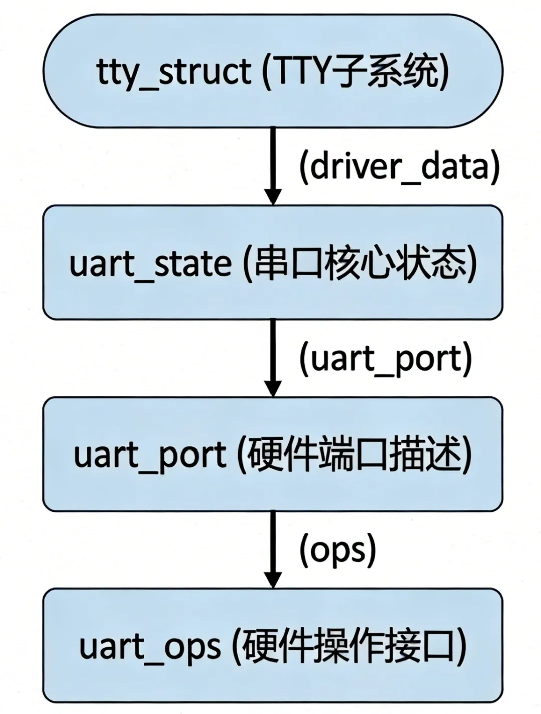 [2].向下:定义 uart_ops 硬件操作接口,让具体 UART 驱动只需实现硬件相关逻辑,无需关心 TTY 层的通用流程;