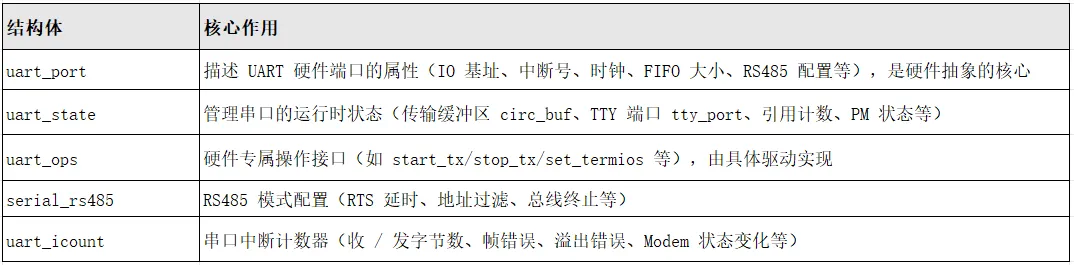 uart_start/uart_stop:启动 / 停止串口发送(对接 TTY 层的发送控制);
