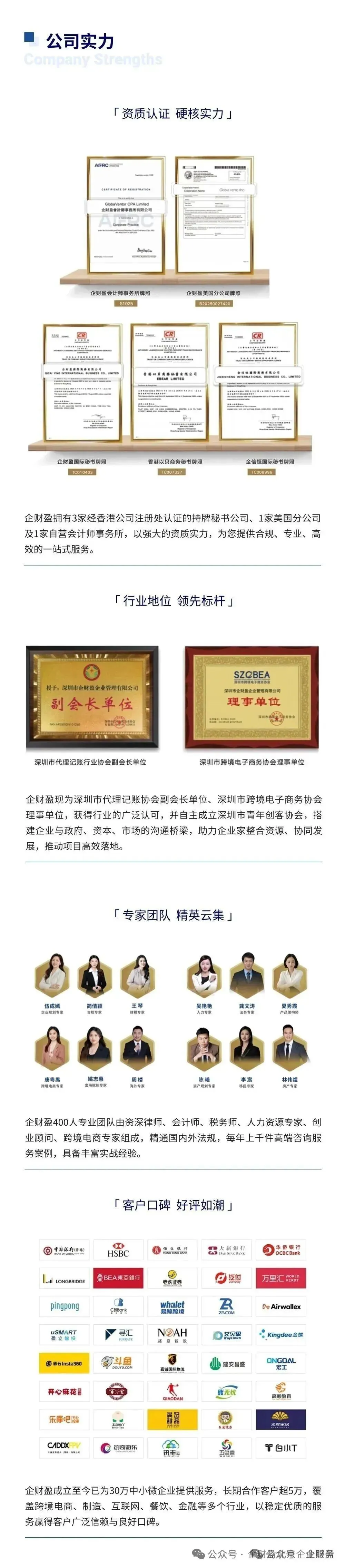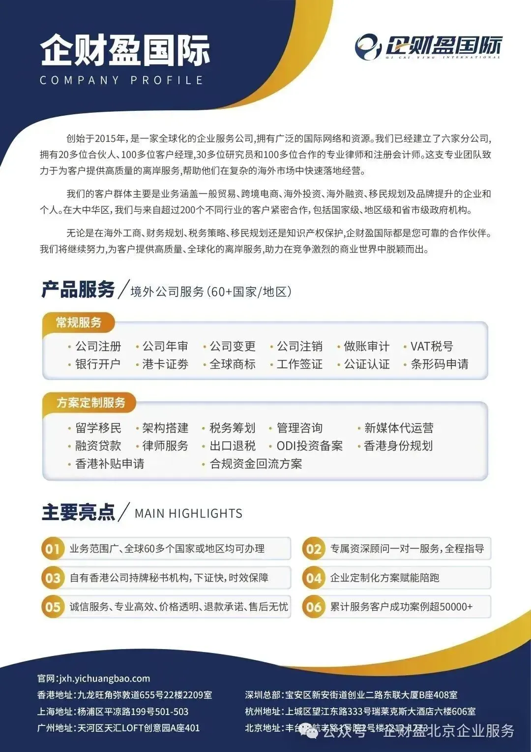 企财盈作为专业的一站式商务服务平台,致力于为广大客户提供香港公司注册、做账报税、年审审计、财税合规、股权架构、ODI备案、香港身份、移民留学等高质量服务。助力企业全球化发展。