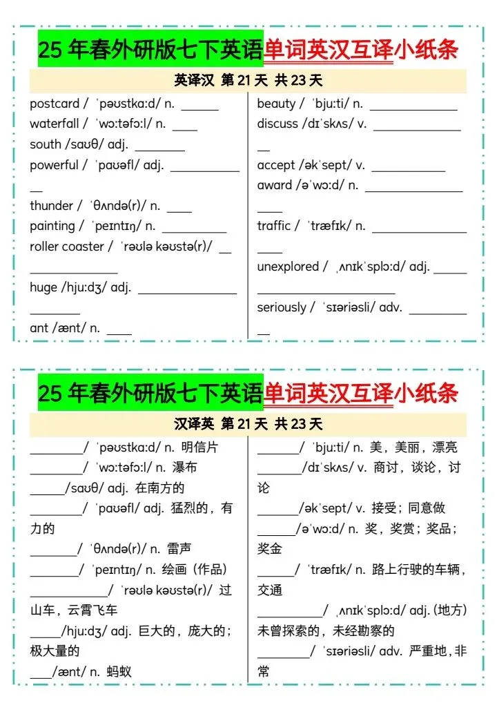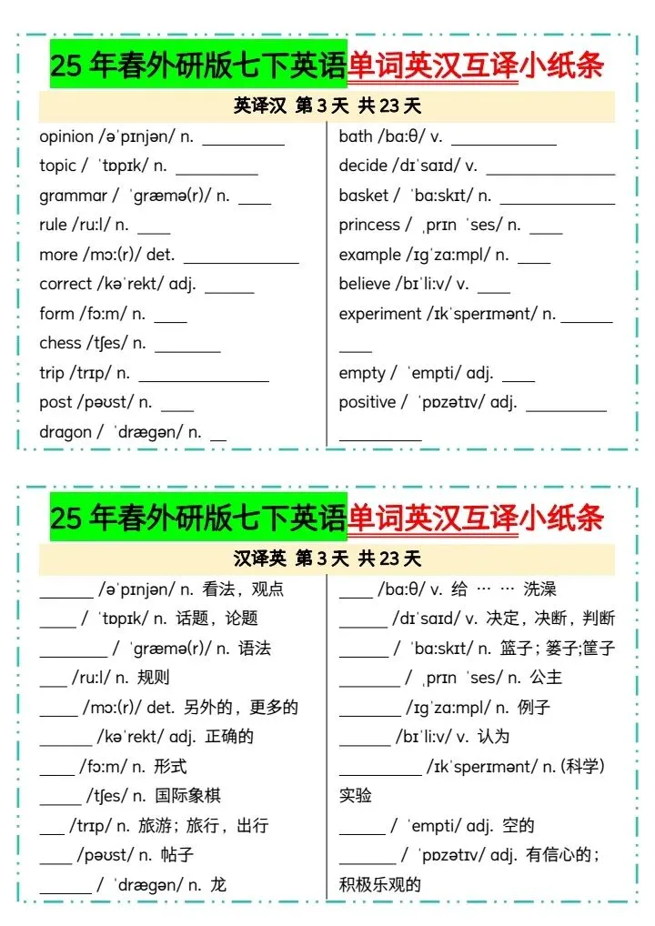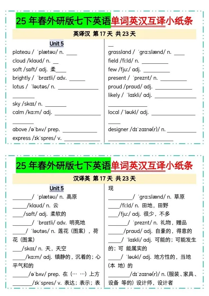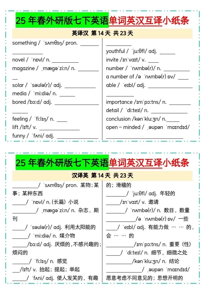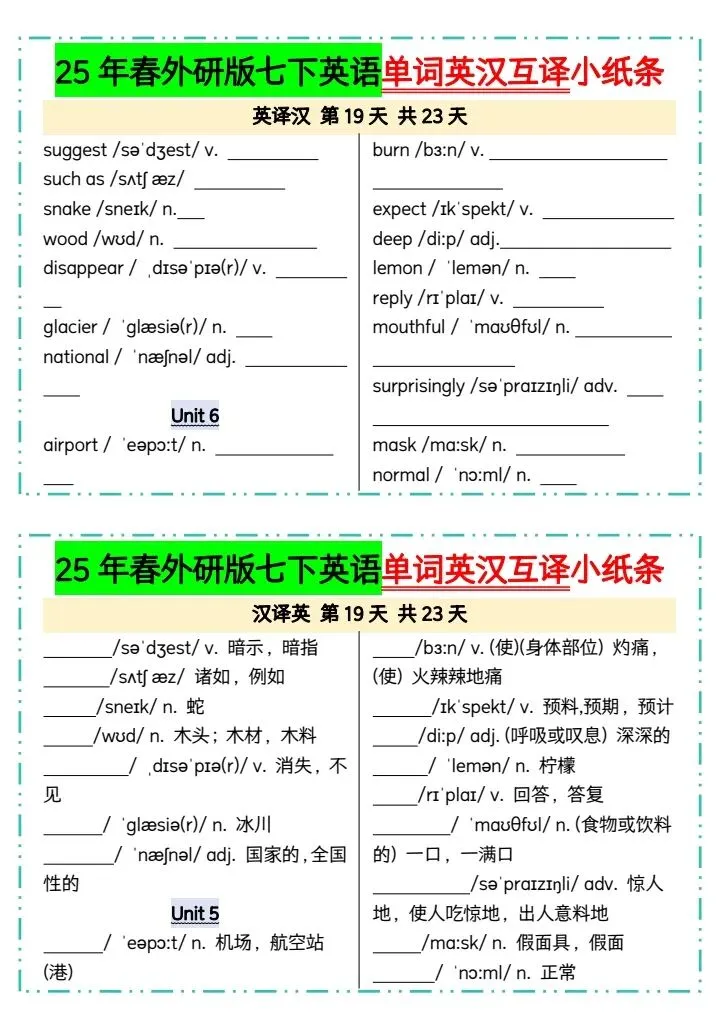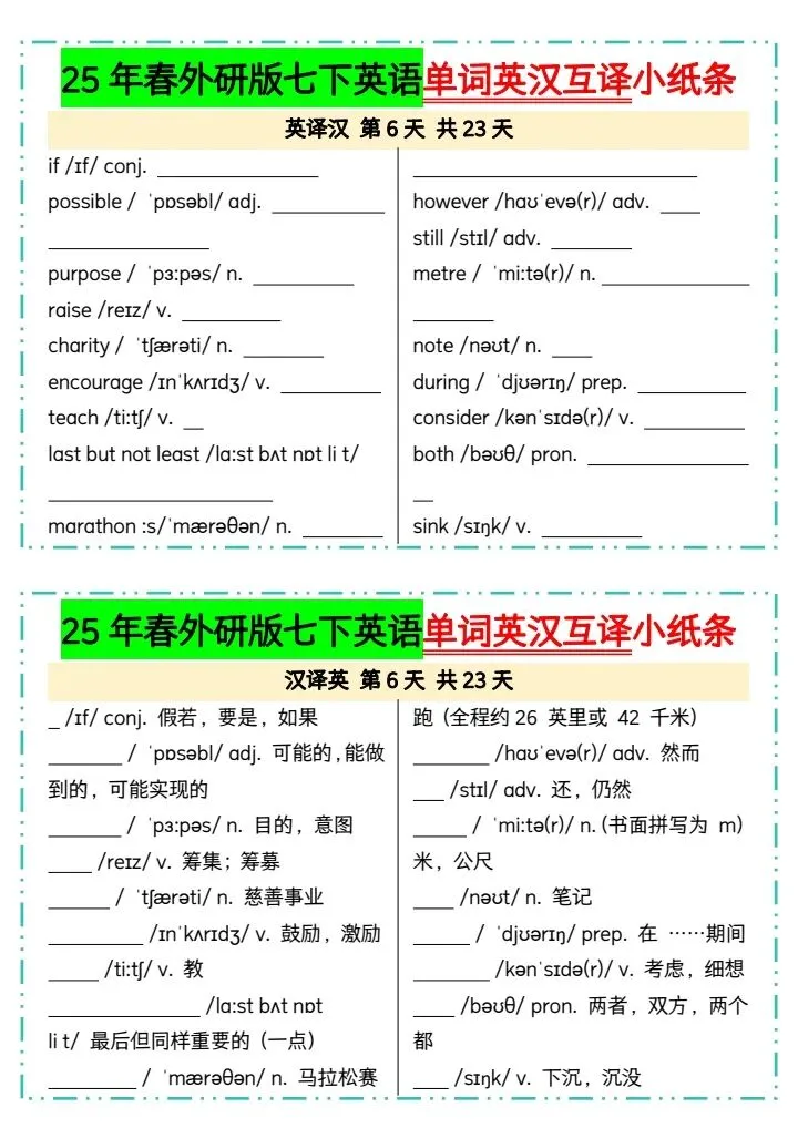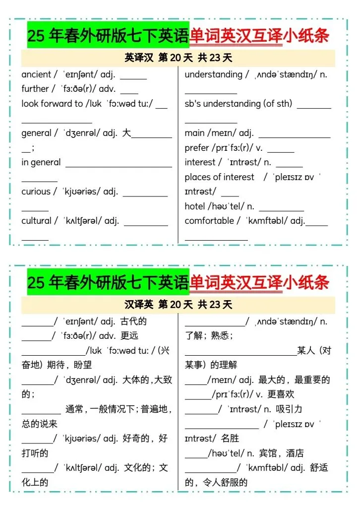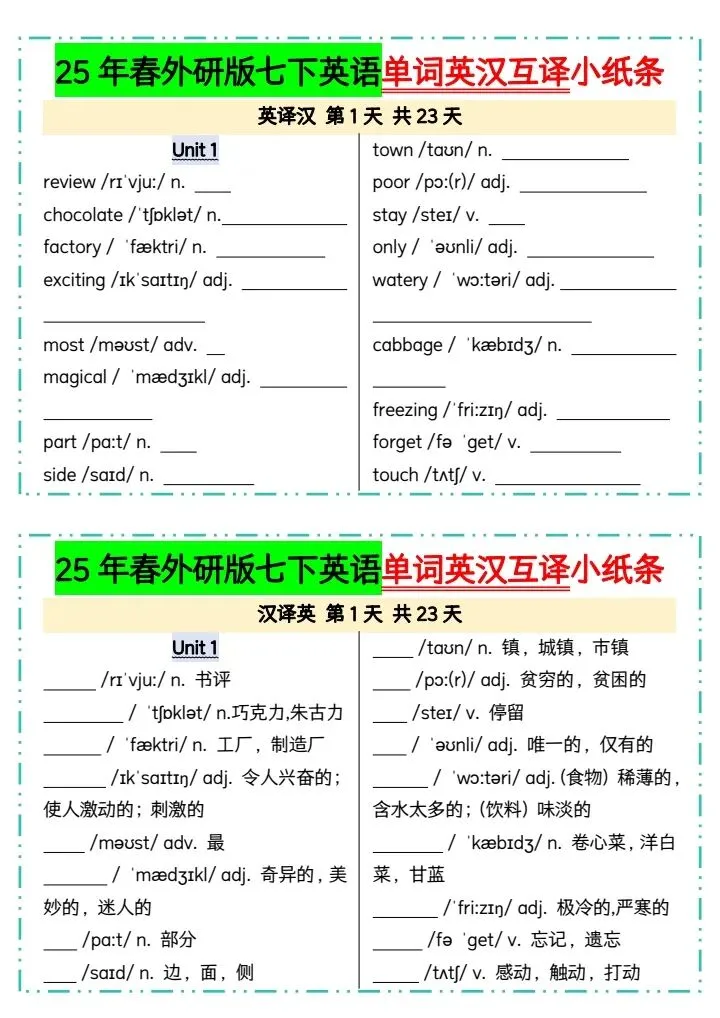 今日分享26新七下英语外研版单词英汉互译小纸条!所有资料均为高清电子版,排版规整适配打印,不用费心整理,直接打印就能用。精准击破学习难点,帮孩子夯实基础、吃透考点,稳步提升学习效率!