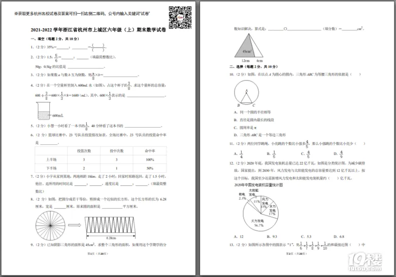 今天为大家准备的是家长上传的上城区六上期末数学试卷,获取试卷完整电子版pdf免费下载及参考答案分析请点击文中的小程序!
