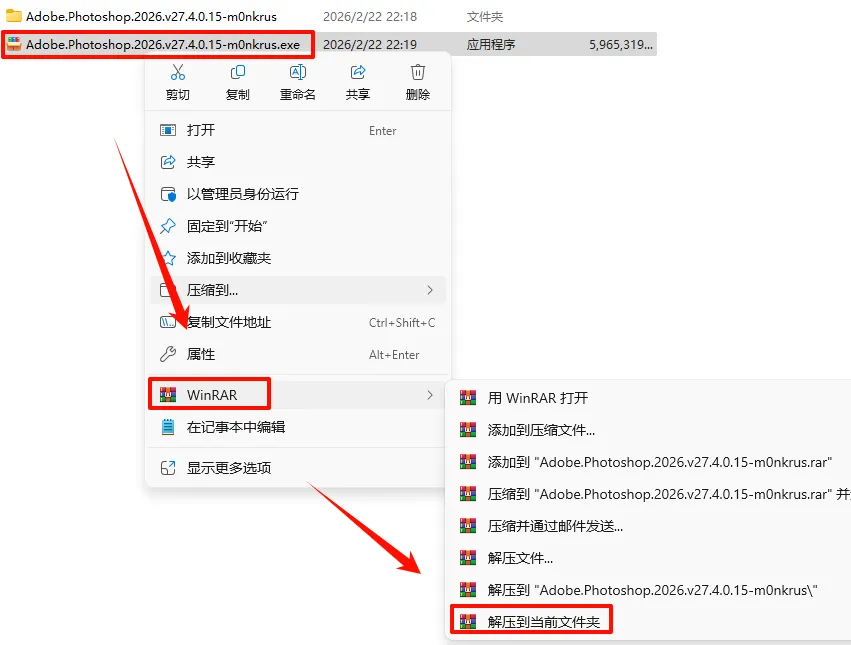 1.进入下载文件夹Adobe Photoshop 2026下载安装包,选中下载的安装包,鼠标右键选择“解压到当前文件夹”(没有解压选项点这里)