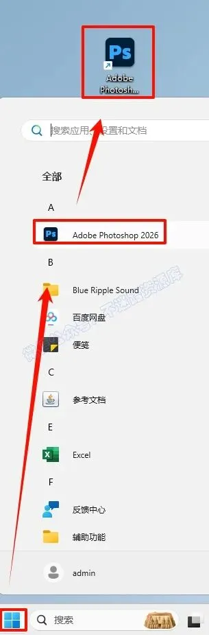 6.点击“开始“菜单栏,点击“所有应用“,找到“Adobe Photoshop“软件,鼠标左键拖拽到桌面上即可创建桌面快捷方式