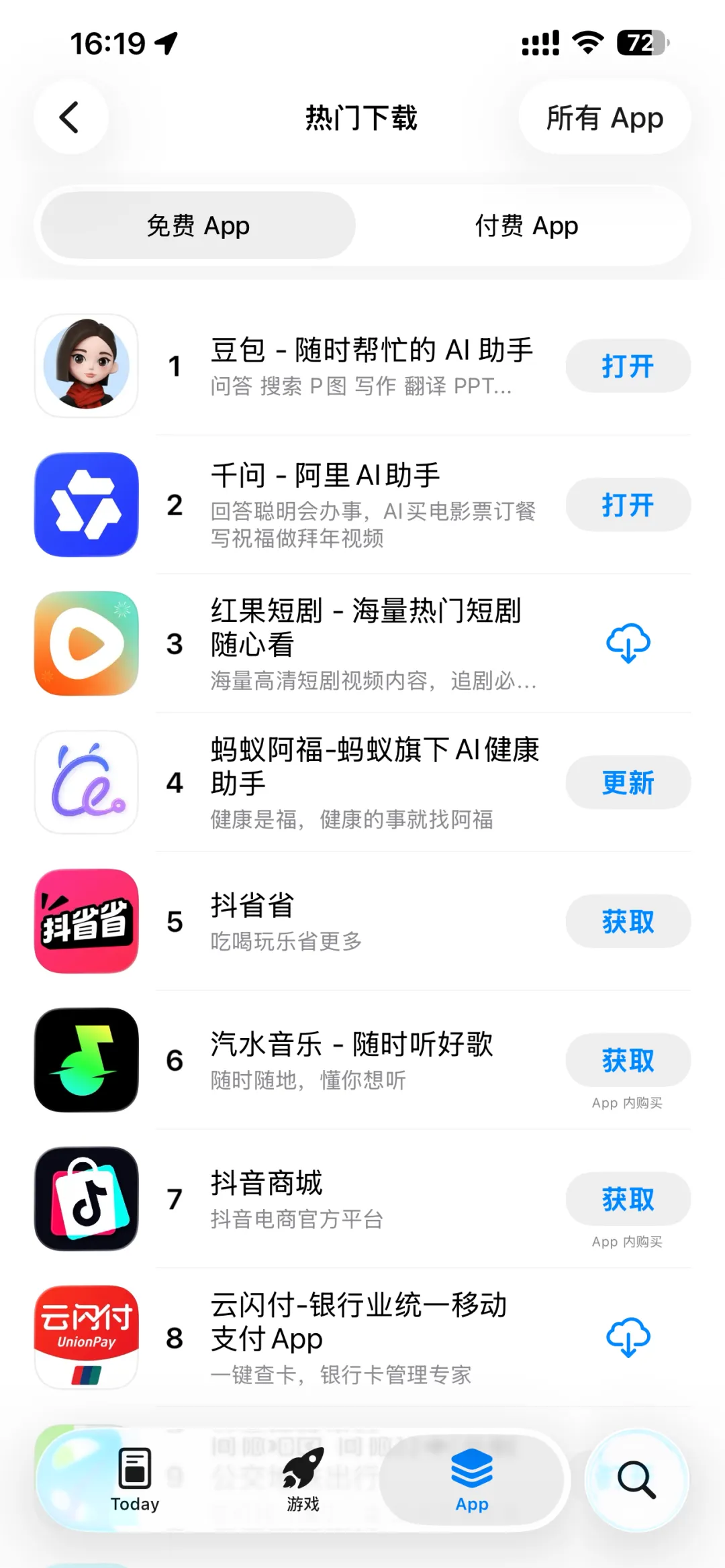 2月23日,苹果App Store免费App下载榜显示,此前凭借10亿元红包活动登顶榜首的腾讯元宝,目前已跌出榜单前十。当前榜单中,豆包位居第一,千问位居第二。