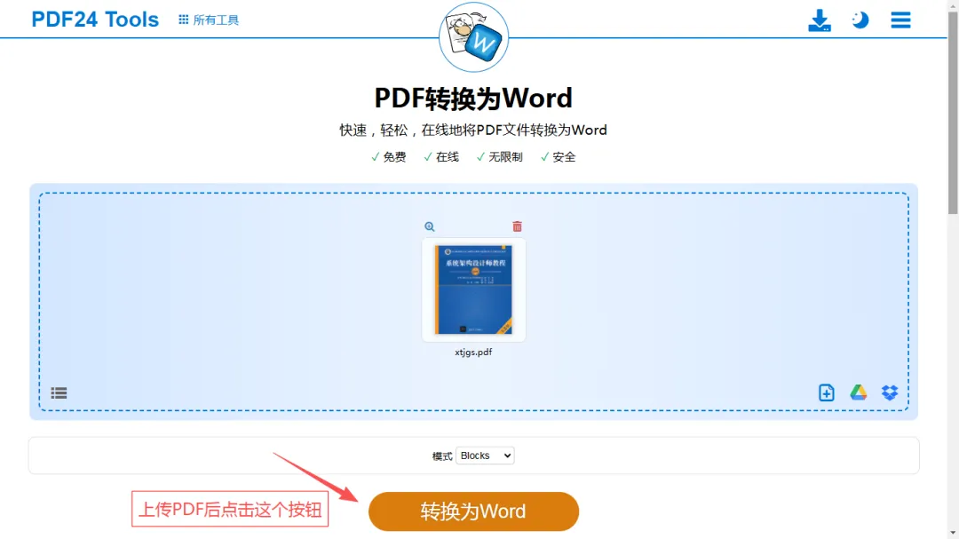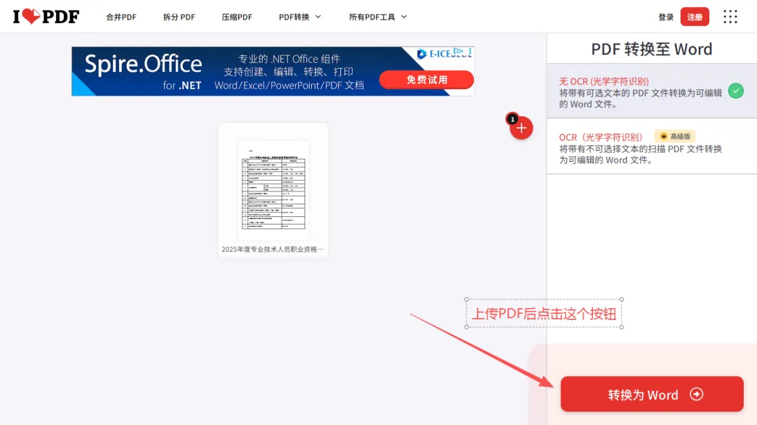 免费版本只支持将带有可选文本的pdf文件转换为可编辑的word文档。上传完后直接点击“转换为Word”按钮就可以转换。