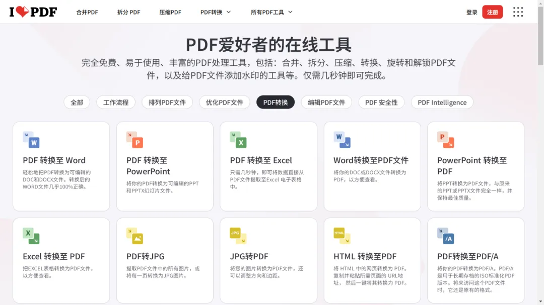 这款工具从排列PDF文件、优化PDF文件、转换为PDF文件、从PDF转换至其他格式、编辑PDF文件、PDF文件的安全、PDF智能等七大方面提供合并PDF、拆分PDF、删除PDF页面、提取PDF页面、扫描为PDF文件、JPG/WORD/PPT/EXCEL/HTMl转换成PDf、PDF转换成JPG/WORD/POWERPOINT/EXCEL、添加页码、裁剪PDF、编辑PDF文件、PDF解锁、PDF加密、PDF签名、PDF标记密文、比较PDF文件、PDF翻译等功能。