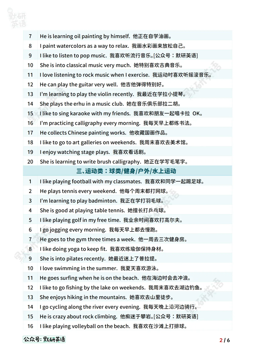 别慌!默研英语整理了「兴趣爱好专属英语口语150句」,覆盖日常所有高频场景,中英对照,拿来就用✅
