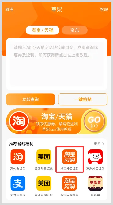 1、打开草柴APP,点击淘宝闪购进入淘宝APP领取淘宝闪购外卖红包;