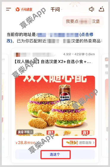 2、通过草柴APP成功领取淘宝闪购外卖红包后,打开千问APP,输入命令“ 我要点*** ”;