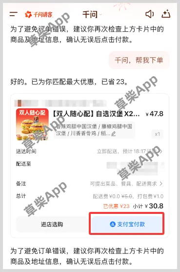 草柴APP如何领取淘宝闪购外卖红包使用千问AI下单优惠力度更大?