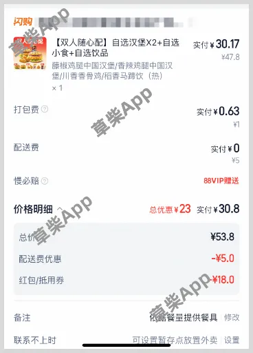 4、选好后下单,默认使用通过草柴APP进入领取的淘宝闪购外卖红包匹配最大优惠;