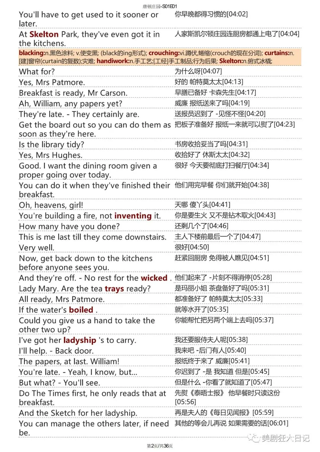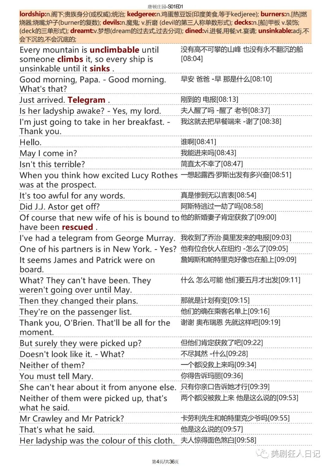 唐顿庄园台词本下载pdf(双语精排版)全6季+单词注释+mp3
