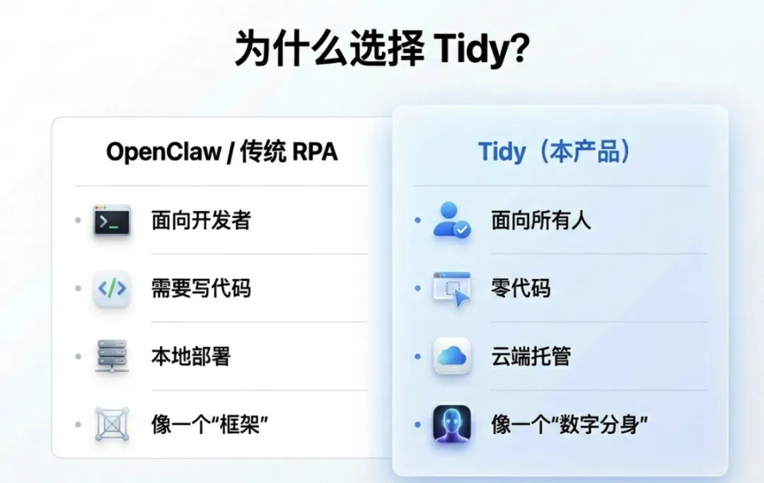 换句话说,OpenClaw这类工具,更像是给开发者准备的“机器人框架”,你需要懂技术才能用好它。而Tidy,是给每一个普通职场人准备的。它的目标用户,就是那些被重复劳动折磨的运营、销售、财务、HR——任何一个有电脑操作需求的人。