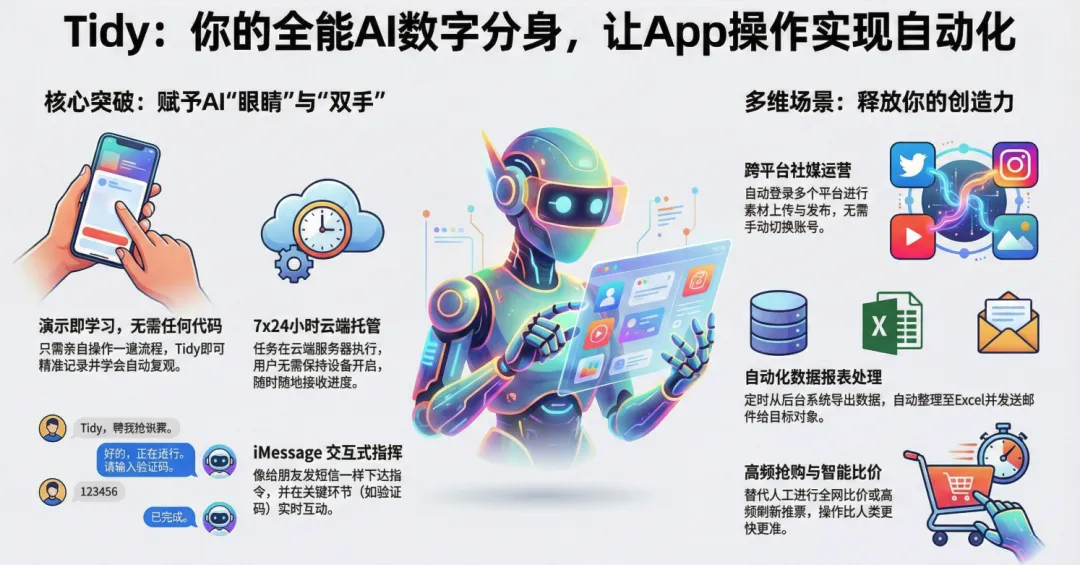 而且,这一切都在云端完成,你完全不需要写任何代码,也不需要搭建复杂的环境。Tidy就像一个云端的大脑,控制着一个虚拟的手机或电脑,替你在各个App里完成那些枯燥的任务。