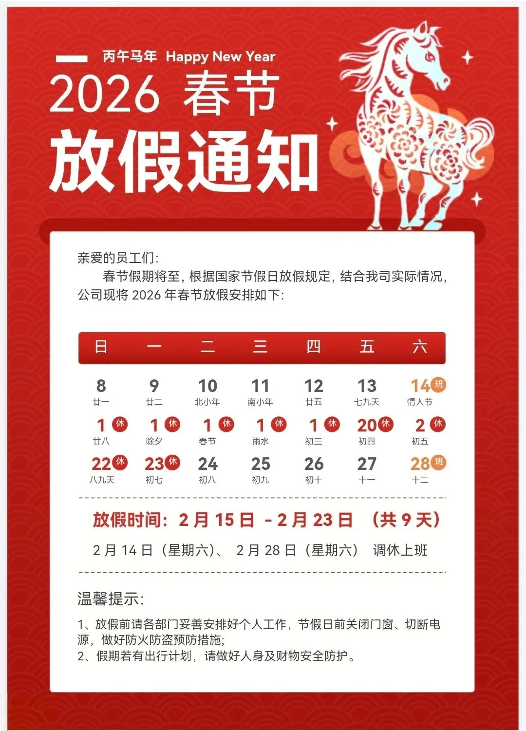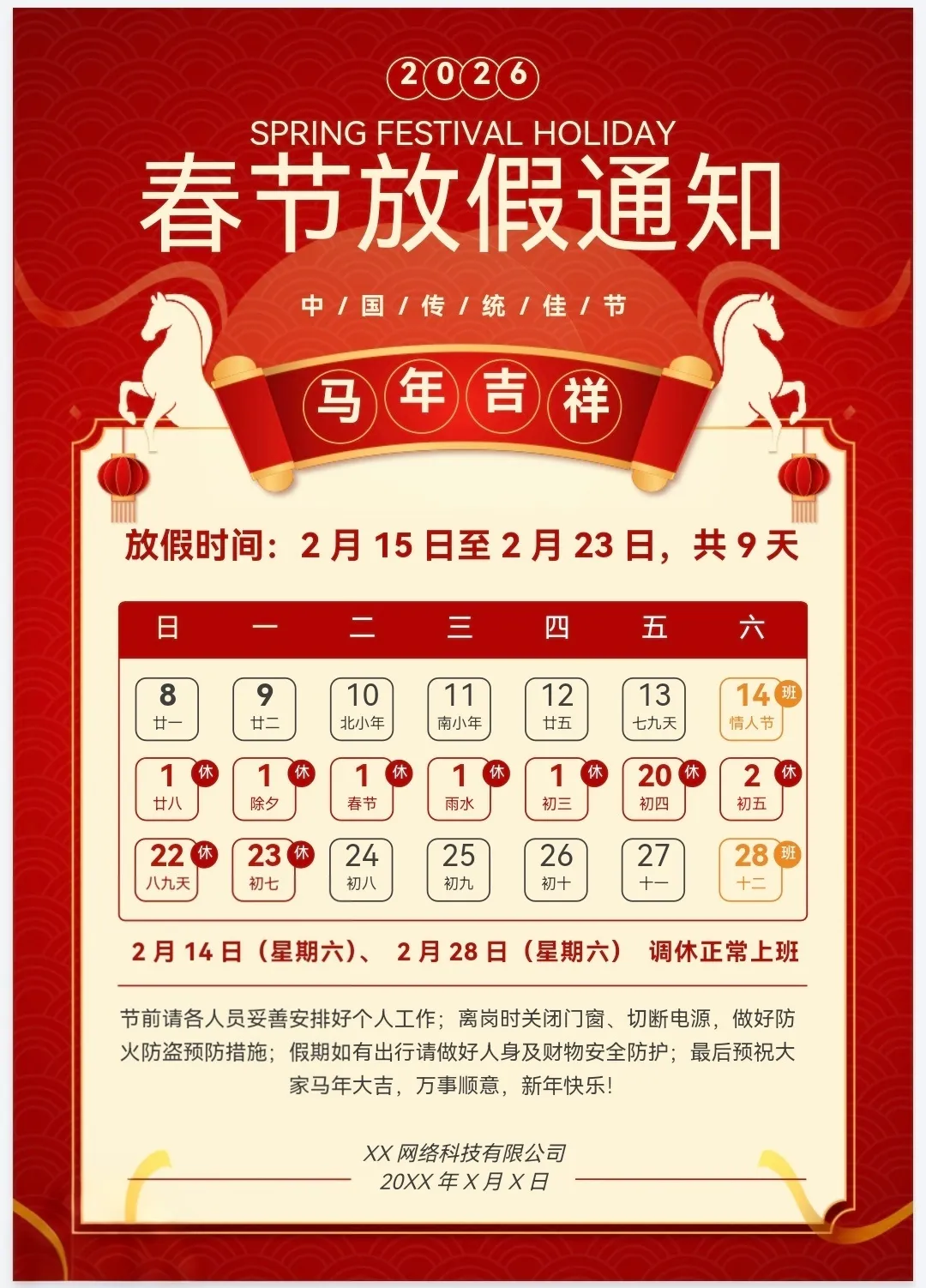 2026年春节放假通知模板(word可编辑)