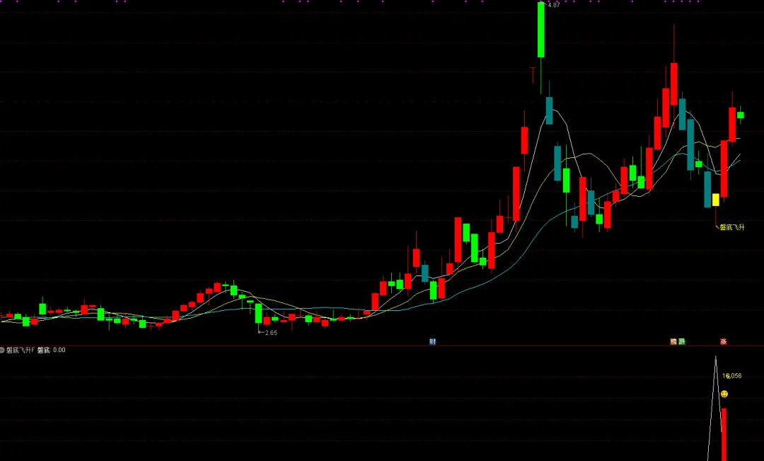 STICKLINE(磐底,OPEN,CLOSE,3,0),COLORYELLOW;DRAWTEXT(磐底,L*0.998,’↖磐底飞升’),COLORYELLOW;