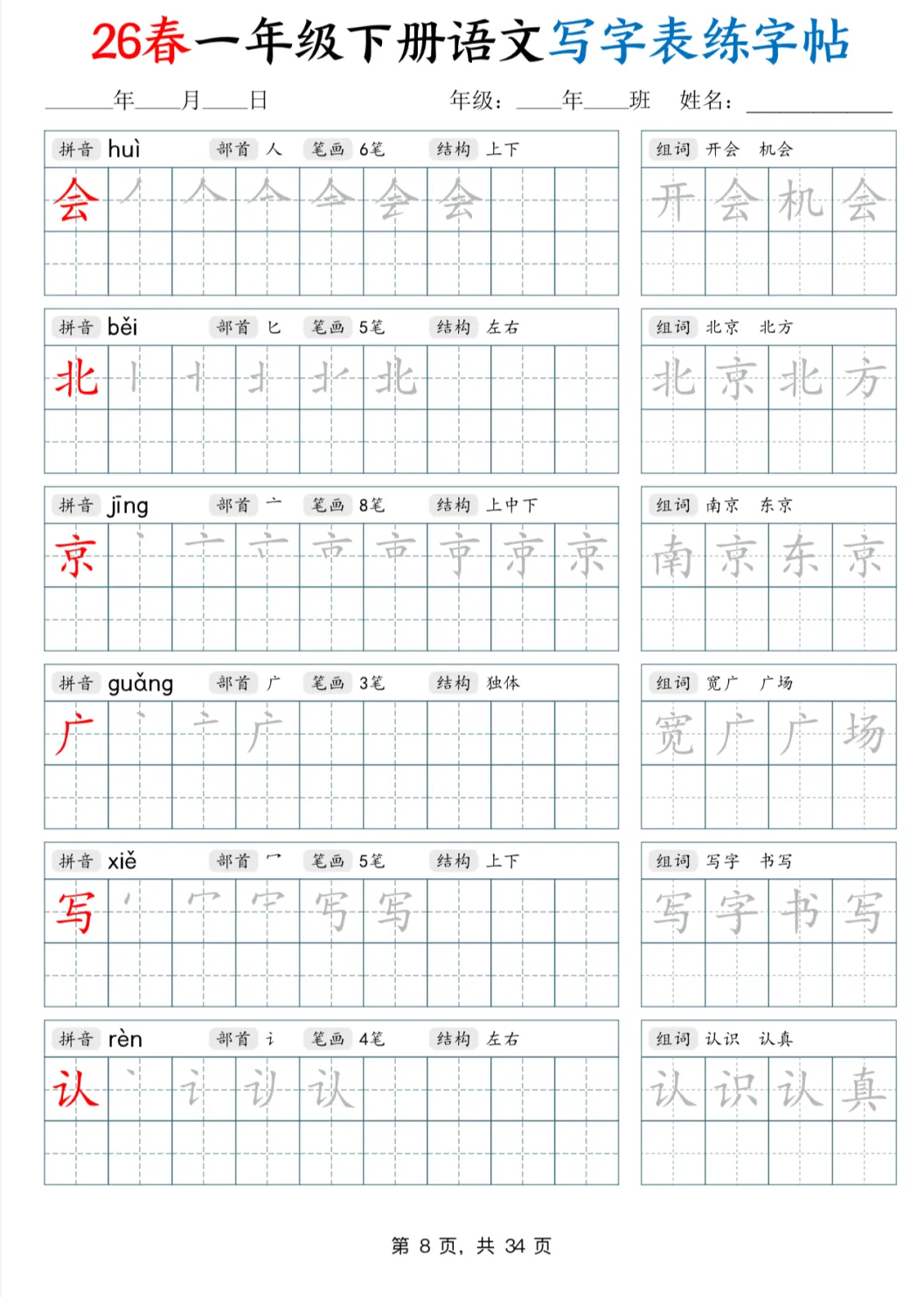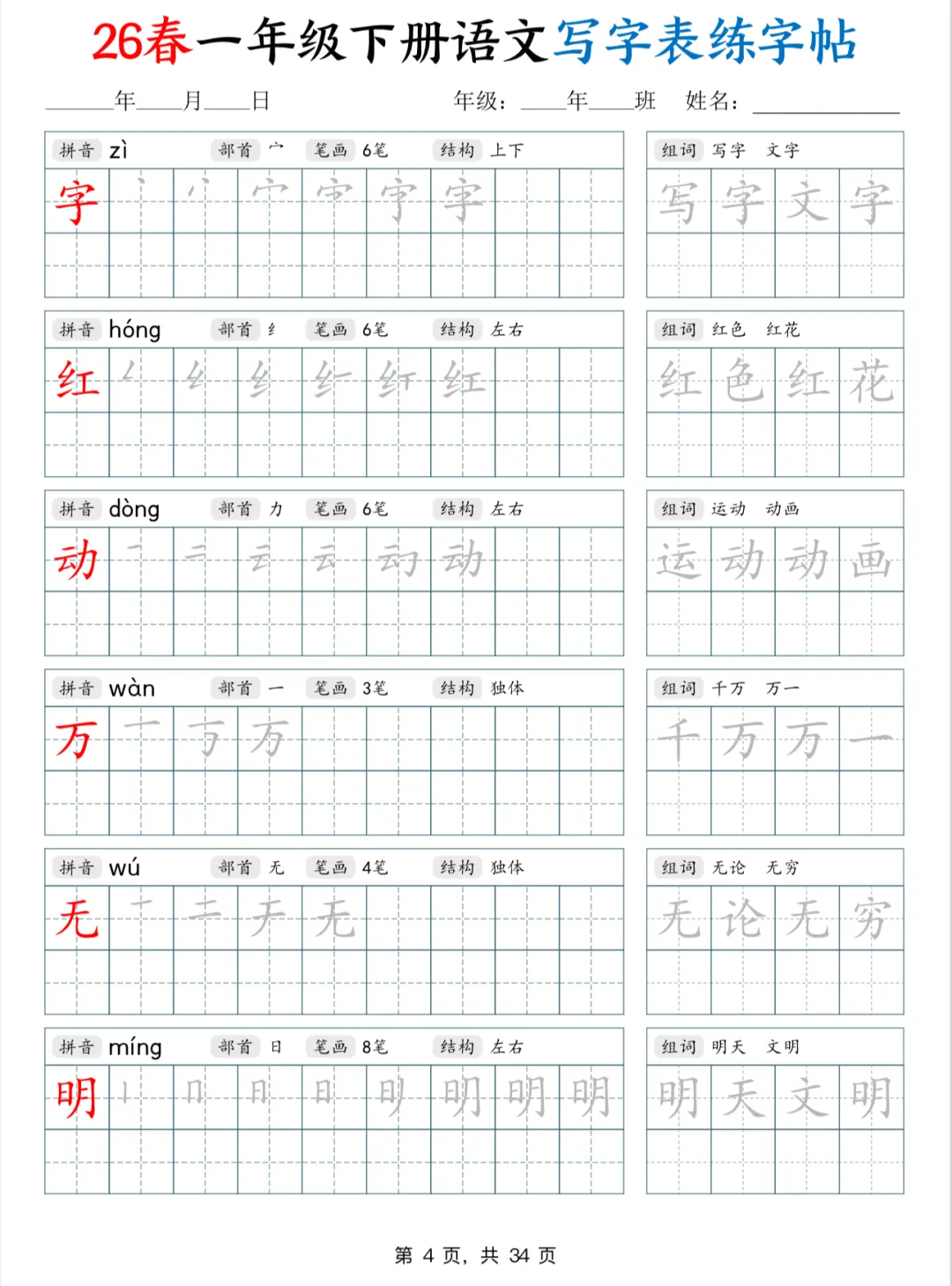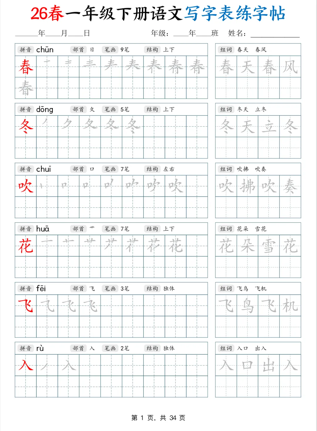 26春季最新版一年级下册语文【写字表字帖】笔顺笔画、偏旁部首、结构、组词、共34页可打印