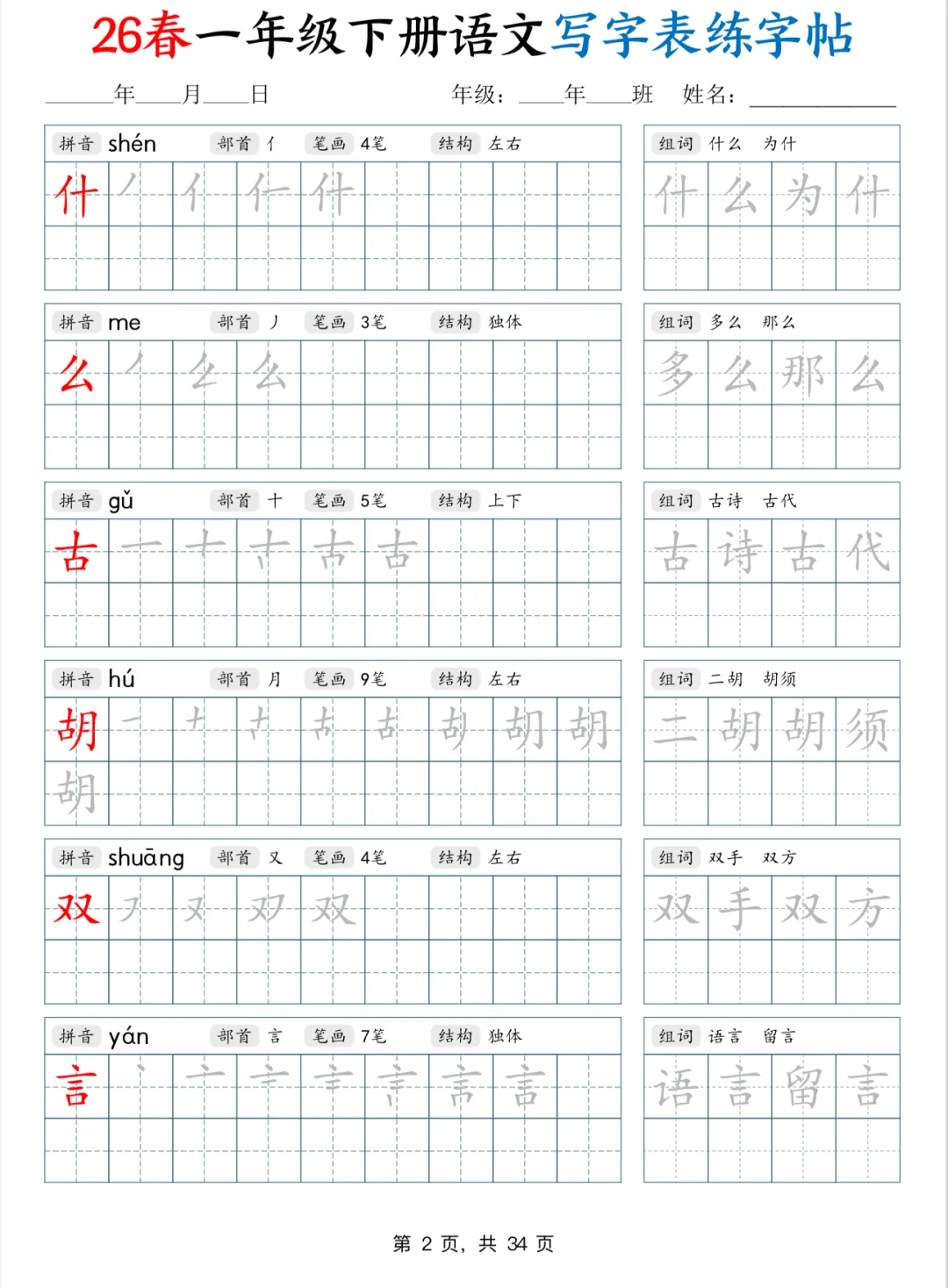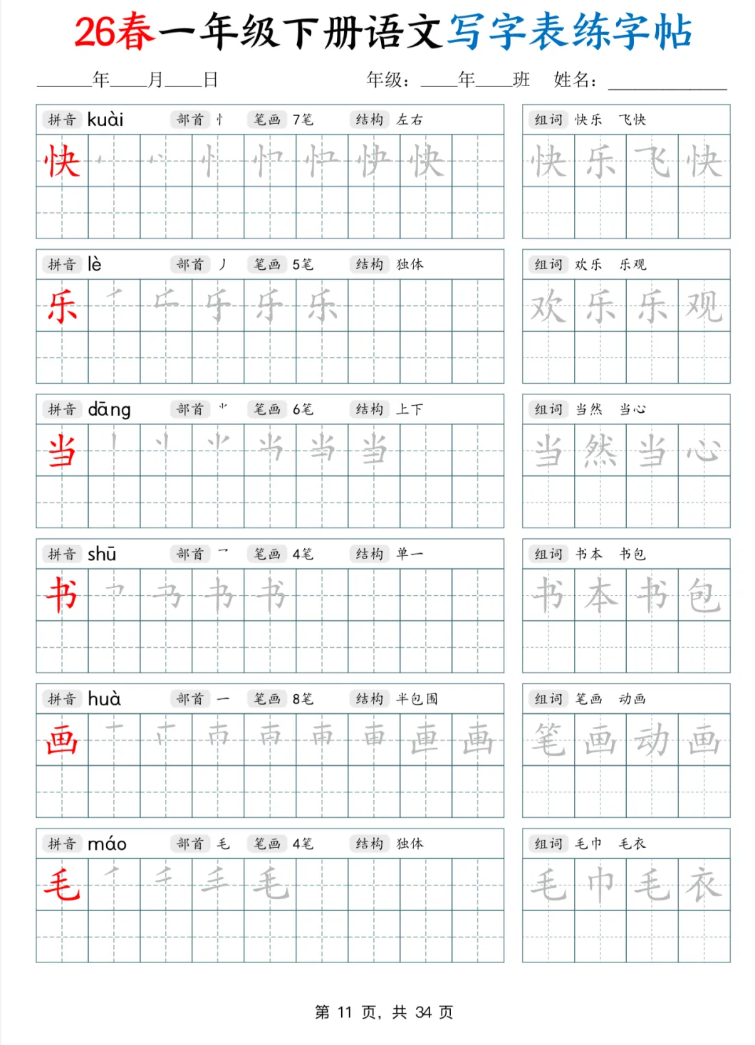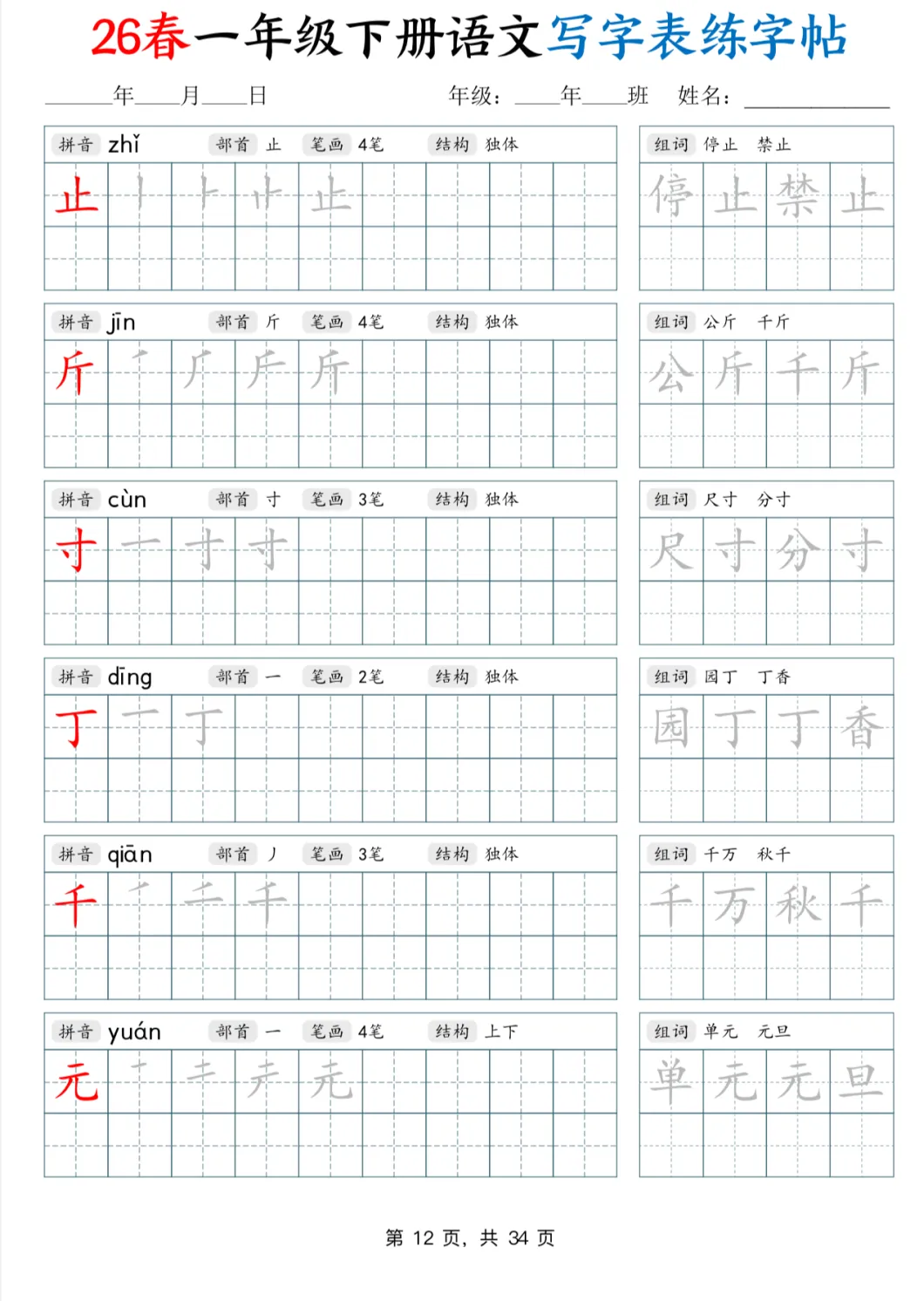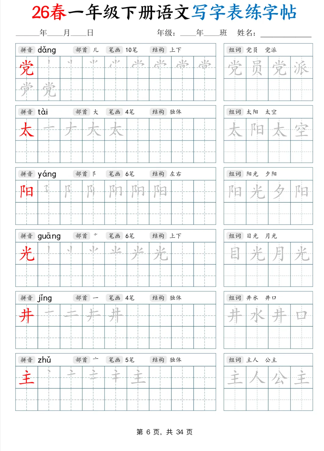 26春季最新版一年级下册语文【写字表字帖】笔顺笔画、偏旁部首、结构、组词、共34页可打印