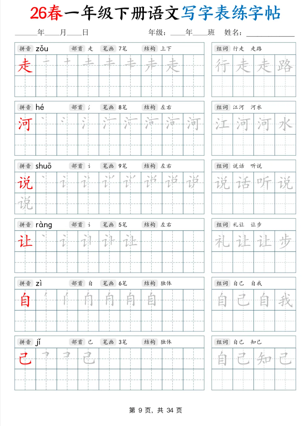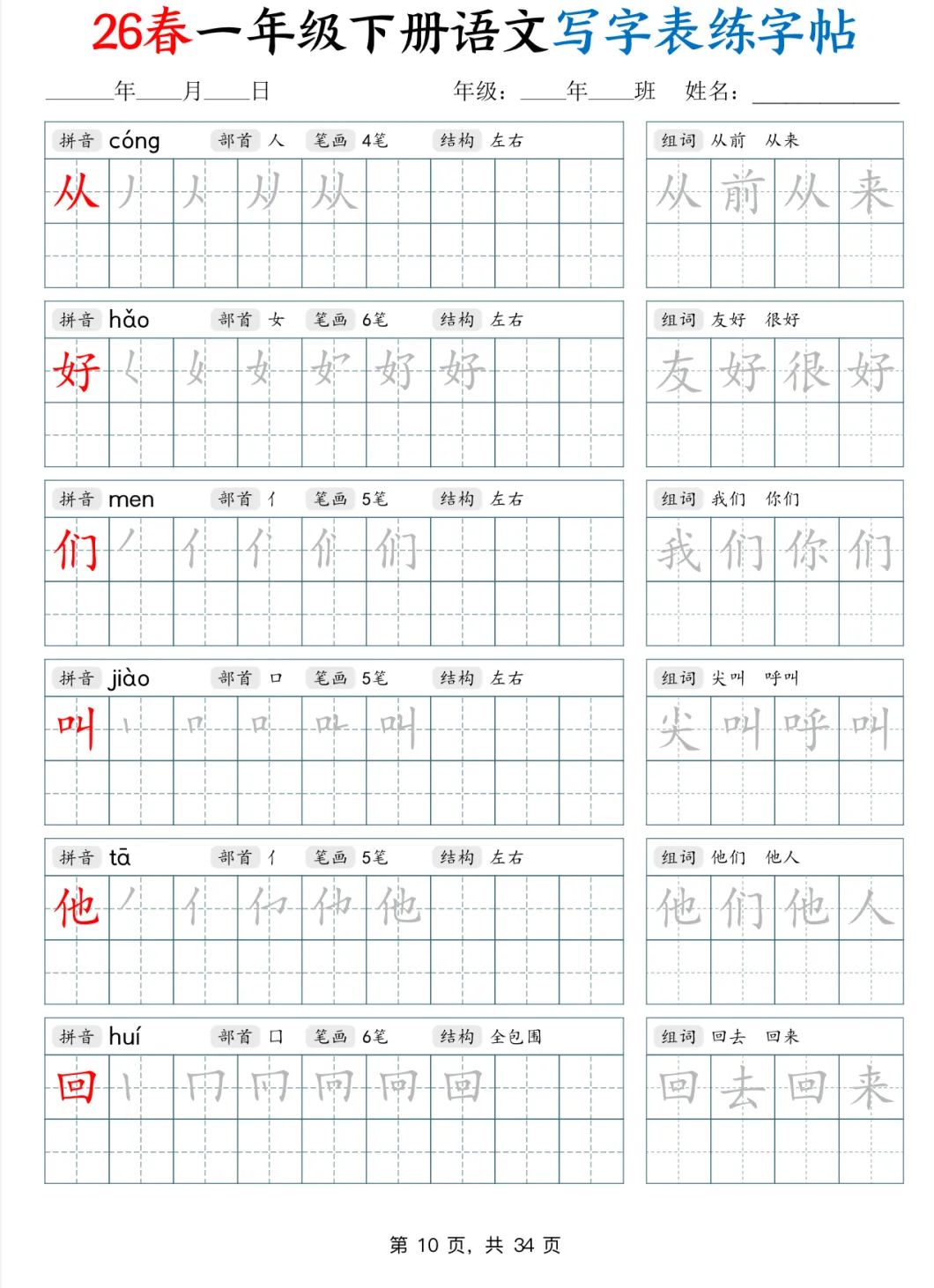 今天为大家分享26春季新版一年级下册语文【写字表练字帖】,这份资料涵盖生字、拼音、部首、笔顺、组词,一页一练,清晰好用!
